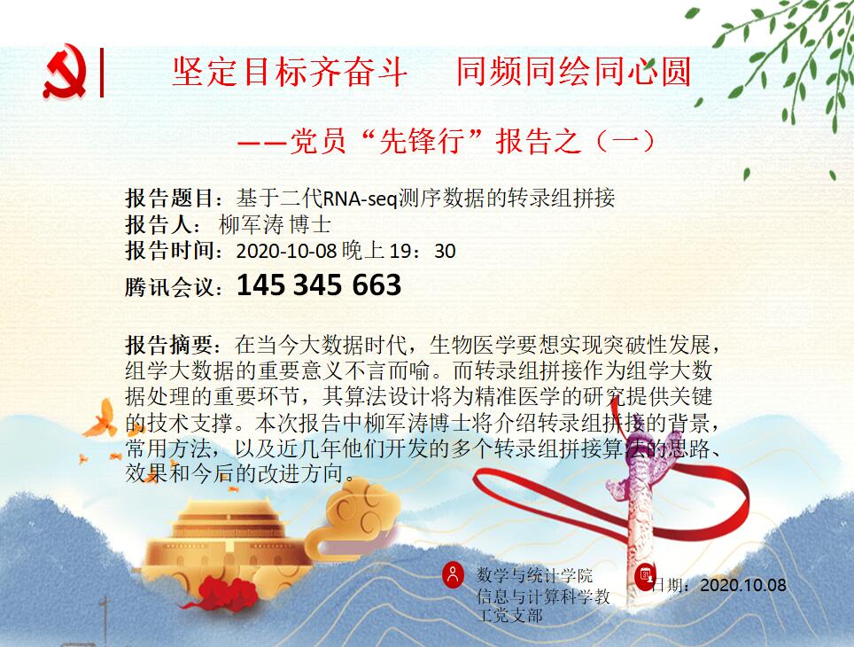 支部党员柳军涛博士率先垂范,面向师生做了主题为“基于二代RNA-seq测序数据的转录组拼接”的专题报告。柳军涛博士介绍了转录组拼接的背景、常用方法,以及近几年团队开发的多个转录组拼接算法思路、效果和今后的改进方向。报告指出转录组拼接作为组学大数据处理的重要环节,其算法设计将为精准医学的研究提供关键的技术支撑。报告结束后,师生进行了充分的交流和研讨,柳军涛对师生们提出的问题进行了一一解答。