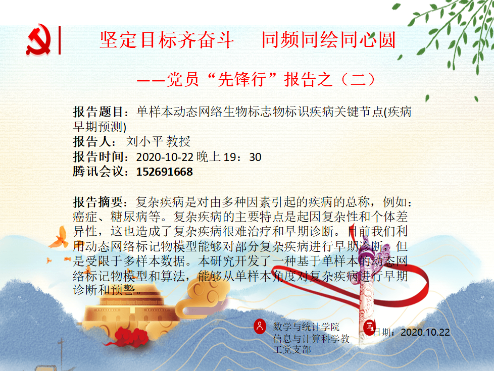本站讯 为进一步发挥党员先锋引领作用,团结带领师生同心同向同行,共同促进学院及学校事业发展,2020年10月22日晚19:30,爱游戏ayx官方网站信息与计算科学党支部组织开展了第二期“坚定目标齐奋斗 同频同绘同心圆——党员‘先锋行’报告”。本次活动由信息与计算科学系教工党支部书记亓兴勤主持,支部党员刘小平教授担任主讲人,信息与计算科学系教师及学院信息与计算科学系部分学生参加。