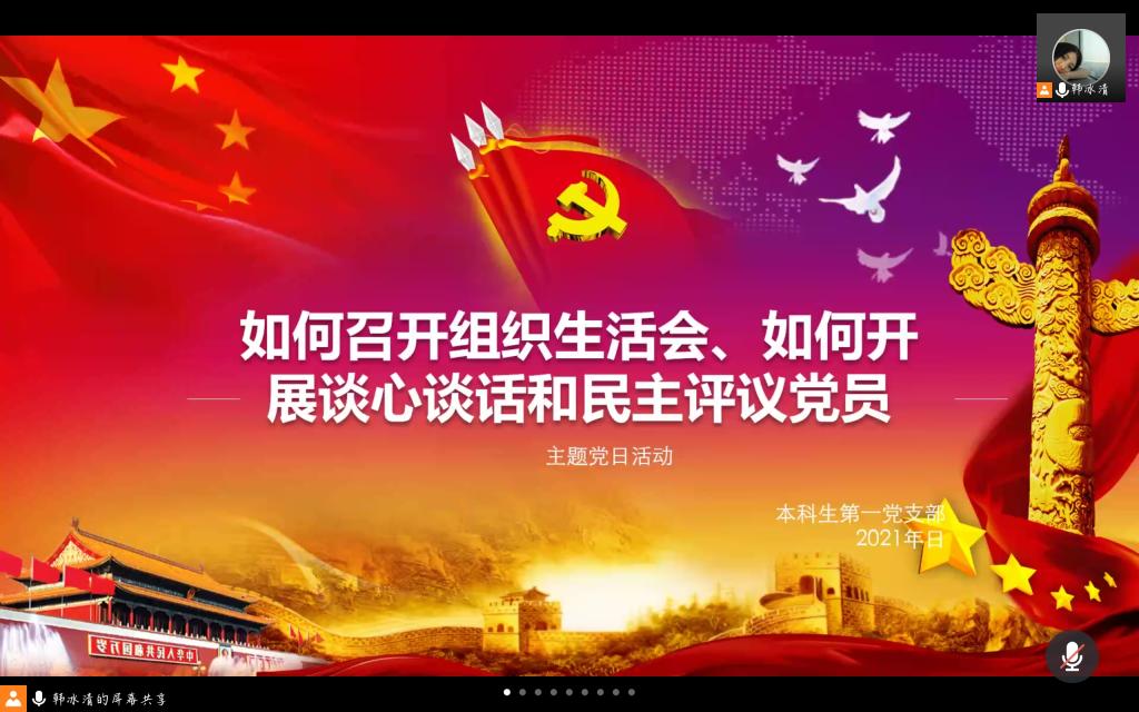 本站讯 为扎实开好2020年度组织生活会,加强支部党员思想认识,2月4日下午,爱游戏ayx官方网站本科生第一党支部于线上开展了“开好组织生活会、提升组织凝聚力”主题党日活动。本次活动由支部党员韩冰清主持,支部全体党员参加会议。