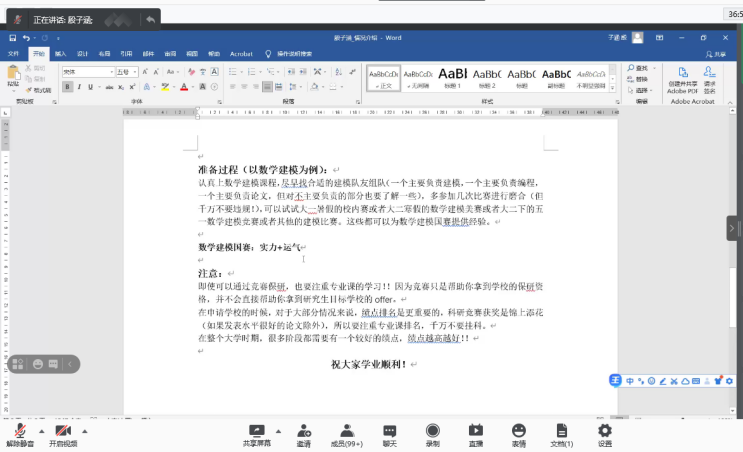 本站讯 为发挥毕业生党员的先锋模范作用,站好毕业前的“最后一班岗”,帮助同学们深入了解考研、保研、出国以及就业形势,引导同学们在今后做出合适的选择,6月11日下午,爱游戏ayx官方网站举办了毕业生党员线上经验分享会。爱游戏ayx官方网站本科生第二党支部委员魏佳佳主持会议,学院非毕业年级全体学生党员、入党积极分子参加此次会议。
