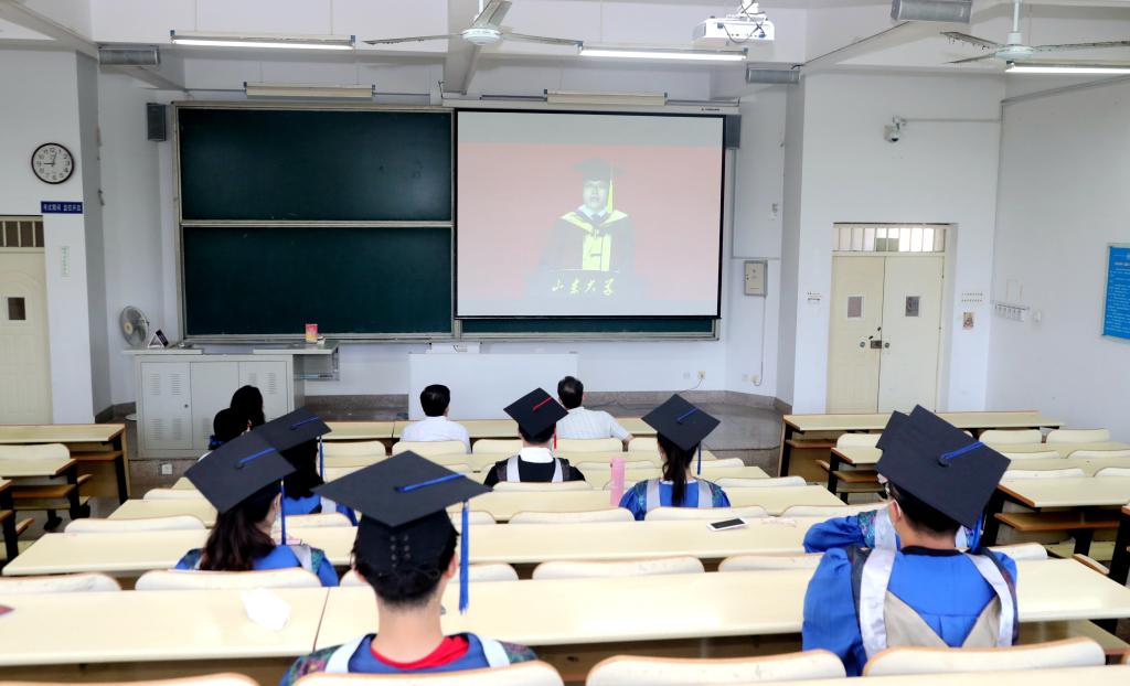 各校区的标志性建筑一一闪过,学生代表引领大家追忆在校时光,回顾山大研究生要做的100件事,师生们送上真挚的毕业祝福。在屏幕前,毕业生们齐唱国歌,学生感言、校长致辞、隔空拨穗礼,均在云端精彩呈现……典礼虽搬至线上,但依然仪式感满满,诚意十足。毕业生们感受到了学校的精心准备和温暖关怀。一场空前特殊的云毕业典礼,虽然相比以往形式不同,但让每一位毕业生留下了相同的感动,为在校学习生涯画上了一个圆满的句号。