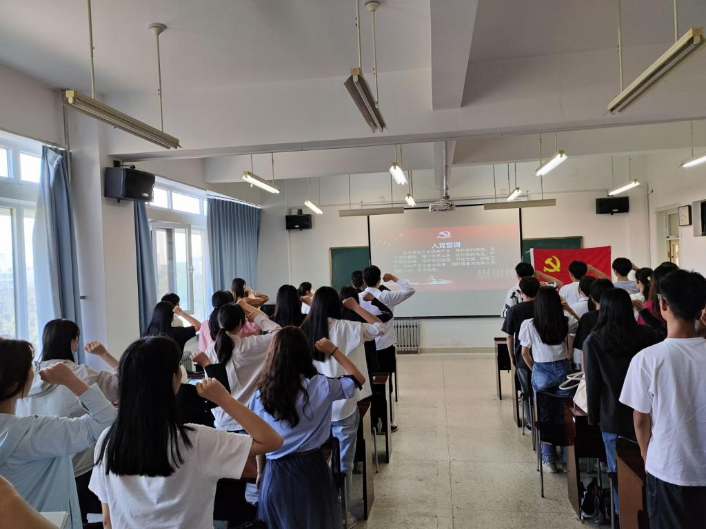 在高亢的国际歌中,此次宣誓仪式正式开始。王祎璠宣读了本次参加宣誓的预备党员名单和重温入党誓词的毕业生党员名单。在2022届毕业生党员董珂的带领下,与会党员举起右拳,面向党旗,进行庄严宣誓,表达自己为共产主义奋斗终身的决心。随后,2020级侯潇涵同志代表新党员发言,她对党组织的关怀培养和党员同志的悉心帮助表达了感谢,她表示,作为一名新党员,将在今后的生活学习和工作中,不断向优秀党员看齐,始终保持党员的先进性,通过学习不断提升自己的思想境界和实干能力,充分发挥党员先锋模范作用。2018级李明威同志代表毕业生党员发言,他对新发展的党员同志表示祝贺,分享了自己加入党组织后思想的进步和成长,鼓励新党员和全体毕业生党员们不忘初心,始终践行全心全意为人民服务的宗旨,坚定不移听党话、跟党走,努力成长为堪当民族复兴重任的时代新人,用行动践行“请党放心,强国有我”的铮铮誓言。