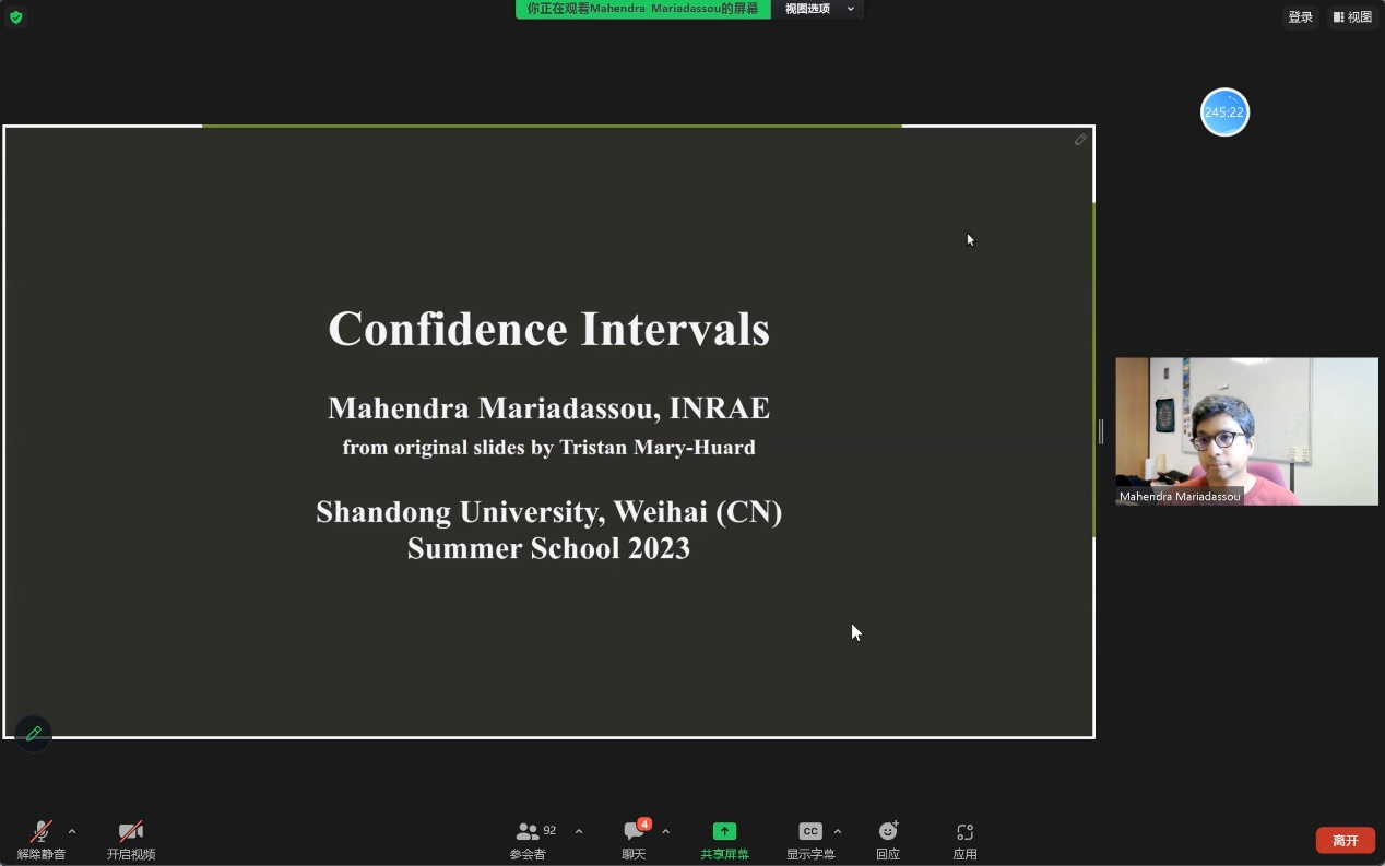 《统计学概论》由王效强副教授作为负责人,由来自法国农业科学研究院的 Mahendra Mariadassou教授主讲。本课程结合实际案例介绍了统计学中统计模型的基础知识,如概率分布、抽样理论、参数估计、假设检验等。在学习专业知识的同时,同学们也意识到了统计学是一门具有广泛应用的数学分支,是一门把实际问题转换成数学问题的学科,更加明白了学习及研究的意义。