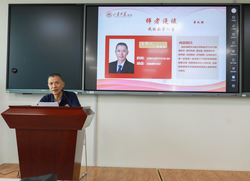 郭新伟教授伴随爱游戏ayx官方网站走过了22个春夏秋冬,是开拓者、建设者,更是陪伴者、服务者。讲座中,他结合个人四十余载的求学和从教生涯,从时间的脉络、环境的优化、身边人的故事三个维度分享了所历、所思、所悟。他用生动的讲述回顾了威海校区办学40年的蓬勃发展,追忆了数学系从成立到改系建院的奋斗历程,分享了一届届数学人笃定前行的历历往事。他说,“传承”是山威数学人的“关键词”。自校区数学系创建以来,山威数学人聚力坚守着数学人的初心,勠力秉承着数学人的本性,接力承担着数学人的崇高使命。他勉励与会的青年教师和学生,要继续传承这种数学人的精神,勇于探索,开拓进取,找到人生的最优坐标,在更大的宇宙空间中释放能力、发光发热。
