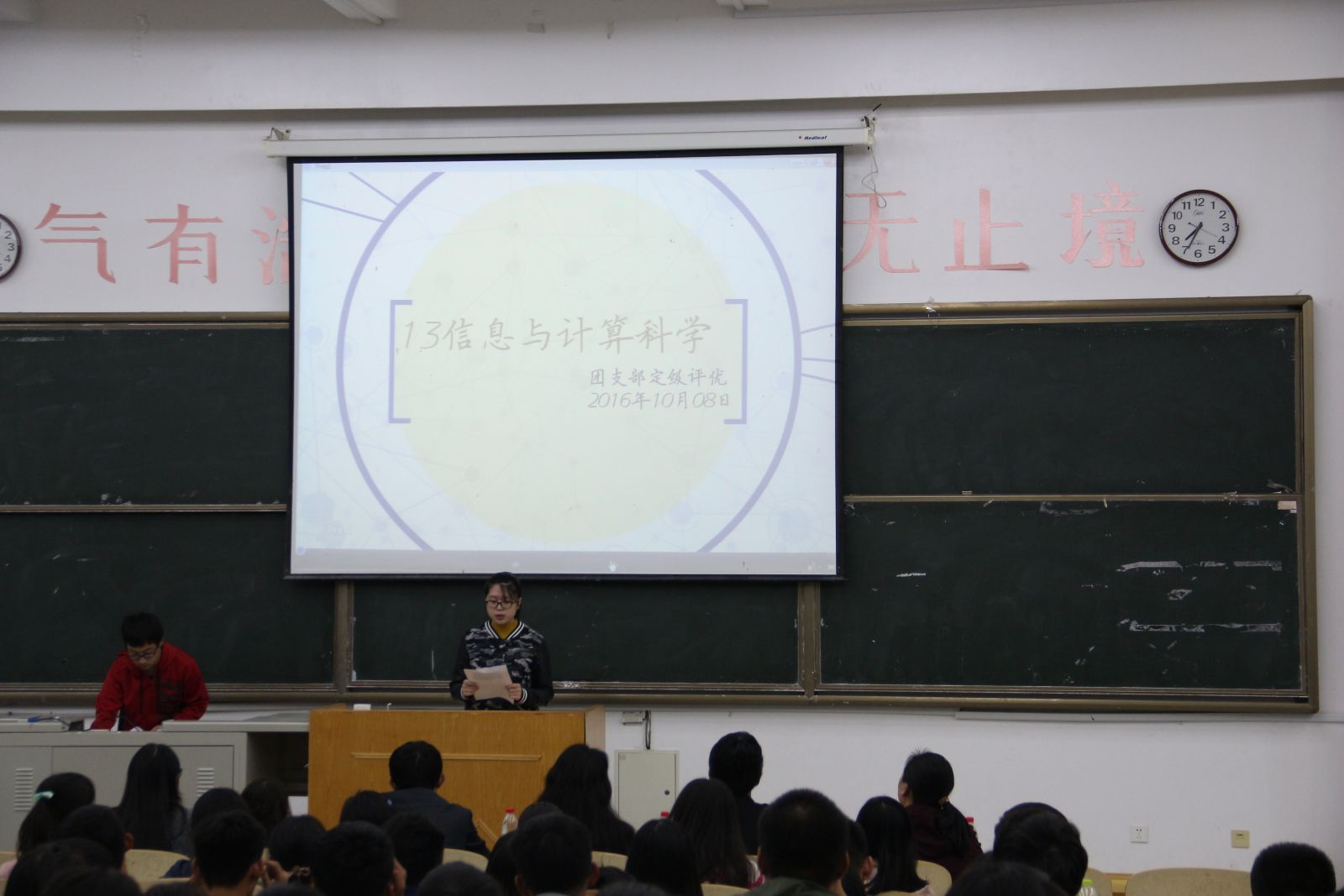 本站讯 10月8日晚,爱游戏ayx官方网站团支部定级评优风采展示会在电子楼102举行。爱游戏ayx官方网站2013、2014、2015级13个团支部进行了定级评优风采展示,爱游戏ayx官方网站2016级全体班委到场观摩学习,党总支副书记单丙波、团总支书记陈昕、全体辅导员、学生会主席王梦冉参加了会议。