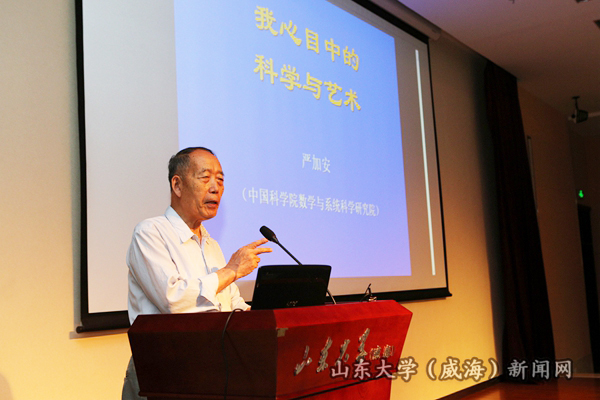 本站讯 6月9日晚,中国科学院院士、数学与系统科学研究院研究员严加安第四期稷下讲坛,在闻天楼报告厅为五百多名师生作了题为“我心目中的科学与艺术”的学术报告。爱游戏ayx官方网站副校长、威海校区校长刘建亚主持报告会,并代表校区接受了严加安捐赠的由其创作的书法作品。