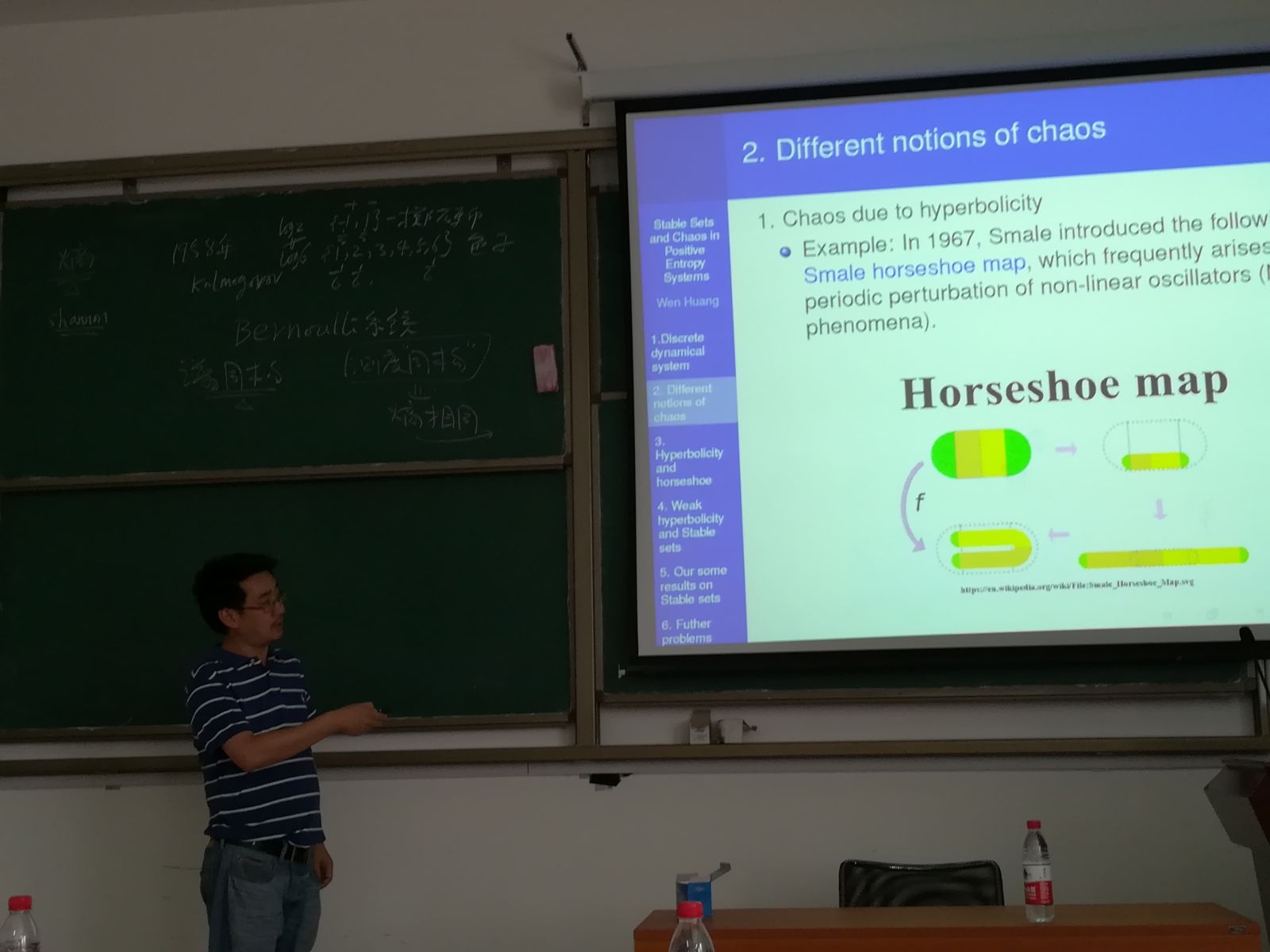 黄文教授的报告系统地给大家讲述了数论与动力系统的关系,并用数论的相关知识解决动力系统中的问题。在7月9号题目为“自然数大子集中的线性结构”中,黄文教授综述自然数大子集中的线性结构的相关进展,主要介绍了正上半Banach密度子集中等差数列公差构成集合的结构,以及两个素数的差组成的集合的结构,并进一步重点阐述了他们与动力系统中高阶Poincare回复定理、特定动力系统点的回归时间等之间的关系。通过黄文教授的第一个报告,我们了解到数学的各个分枝是融会贯通的,知识是彼此相通的。在7月11号,黄文教授题为“测度复杂性和莫比乌斯函数不相交性”报告中,重点讲述了数论与动力系统相交叉的一个猜测,即Sarnak关于莫比乌斯不交性的猜测。首先黄文教授先简短的介绍了Sarnak猜测相关的背景和最近的一些进展;然后对一个动力系统不变测度引入测度复杂性的概念,介绍其最近与叶向东教授,王之任教授合作的一个结果。此报告让师生对此方面的问题有了进一步的认识。在最后一个题为“Stable Sets and Chaos in Positive Entropy Systems”报告中,黄文教授给出一个具有正熵的动力系统的混沌现象。黄文教授首先采用通俗易懂的语言为我们讲解了当一个动力系统具有弱马蹄形时,它具有正熵这一现象。随后又举例说明洛伦兹吸引子具有弱马蹄形,方便我们对上述现象的理解。此外,黄教授还介绍了C1微分同胚系统的Hausdorff维数以及稳定集和不稳定集的混沌行为具有正熵。在此报告中黄教授还讲了自己的研究经历,借此鼓励我们认真学习,平常心对待科研压力。