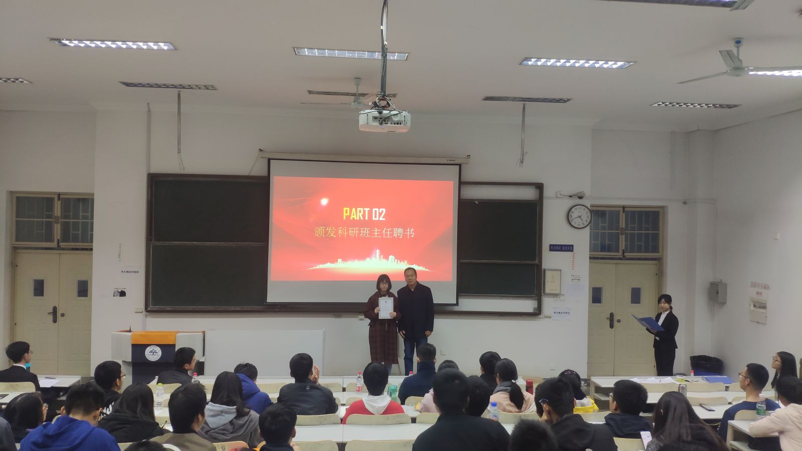 活动伊始,科技学术部部长罗荞荞公布学院第十二届科研班主任名单及其个人基本情况、学院对本届科研班主任授课监督机制,总结往届学院科研班主任成果,提出本届科研班主任目标。活动第二阶段,到场嘉宾分别为第十二届科研班主任颁发聘书并合影留念。颁奖后,第十一届与第十二届科研班主任代表进行发言,讲述了对其工作的总结与展望。活动最后,赵呈海代表2018级数学与应用数学新生发言,提出自身对科研的理解和经历,以及对第十二届科研班主任的期望与建议。