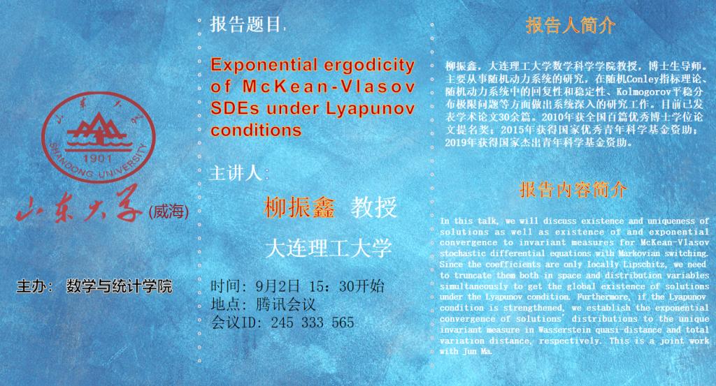 学术报告:Exponential ergodicity of McKean-Vlasov SDEs under Lyapunov conditions