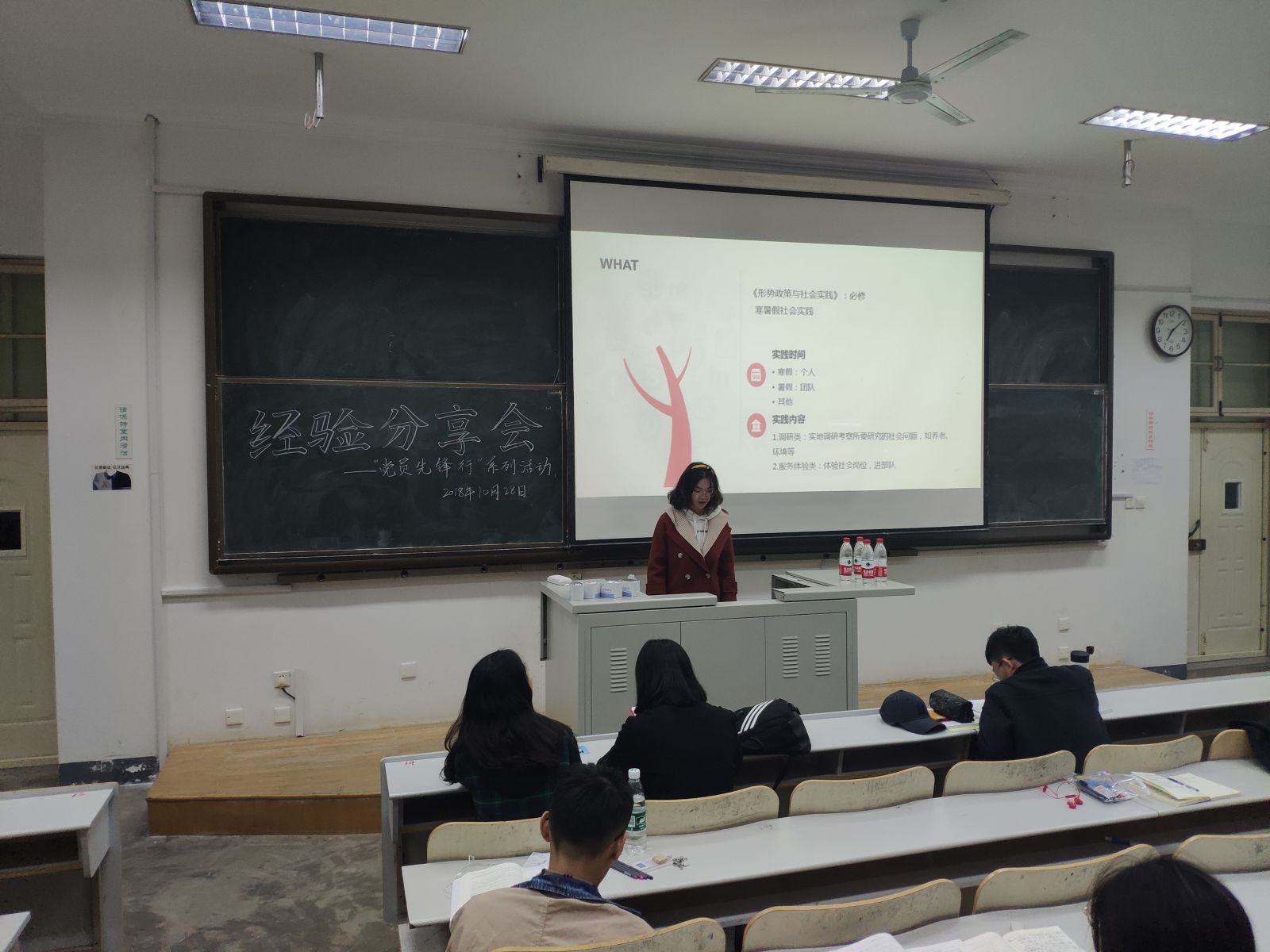 本站讯 2018年10月28日晚,2018级信息与计算科学班在图东教学楼326教室举办了党员分享会,出席分享会的有2015级信息与计算科学班党员代表欧阳立韩、董舒凡、李珍、李盈园。2018级信息与计算科学班的全体同学参加会议。