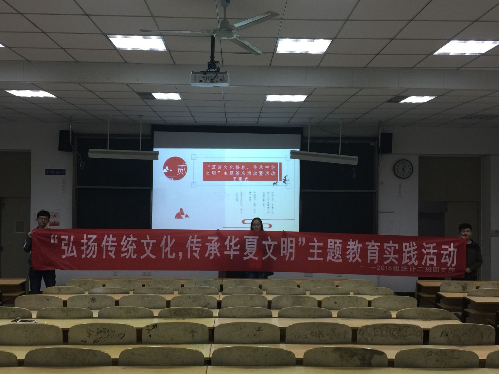 下午四点二十分,活动准时开始。活动分为三个部分。首先,龚健欢对开展主题教育立项以来的一系列活动进行回顾,他总结道:从教育立项开幕式的“传承中华传统文化 从我做起”主题讲座,到“我的家乡——民俗文化”线上活动,再到“致敬马路天使,传承敬业美德”体验基层活动,中期的“弘扬端午文化,传我浓情粽香”传统节日宣传活动,“品经典文化,颂诗词歌赋”知识竞赛活动,后期的“我身边的美德”线上话题活动,直至“传统手工竞相绽,经典文化继相传”主题观影活动,统计二班的教育立项活动一步一步深入,将传统文化这一核心主题通过多种形式,多种途径贯穿到班级的建设中来。在这一过程中,全班同学积极参与线上线下的系列活动,提升了文化修养,传承了中华文明。主题立项活动达到了预期的成果。随后,进入同学感悟交流部分。王祎晨主动上台与大家交流自己的收获和感悟。他提到,自己原本认为传统文化活动会十分枯燥,但在参与了主题教育立项活动后,体会到了传统文化的魅力所在,自己现在对传统文化充满兴趣和热爱。最后,龚健欢组织了横幅签名活动,同学们在活动主题横幅“弘扬传统文化,传承华夏文明”上签下自己的名字,并走到教室外,发动更多的同学将名字签下。至此,主题教育立项活动闭幕式结束。