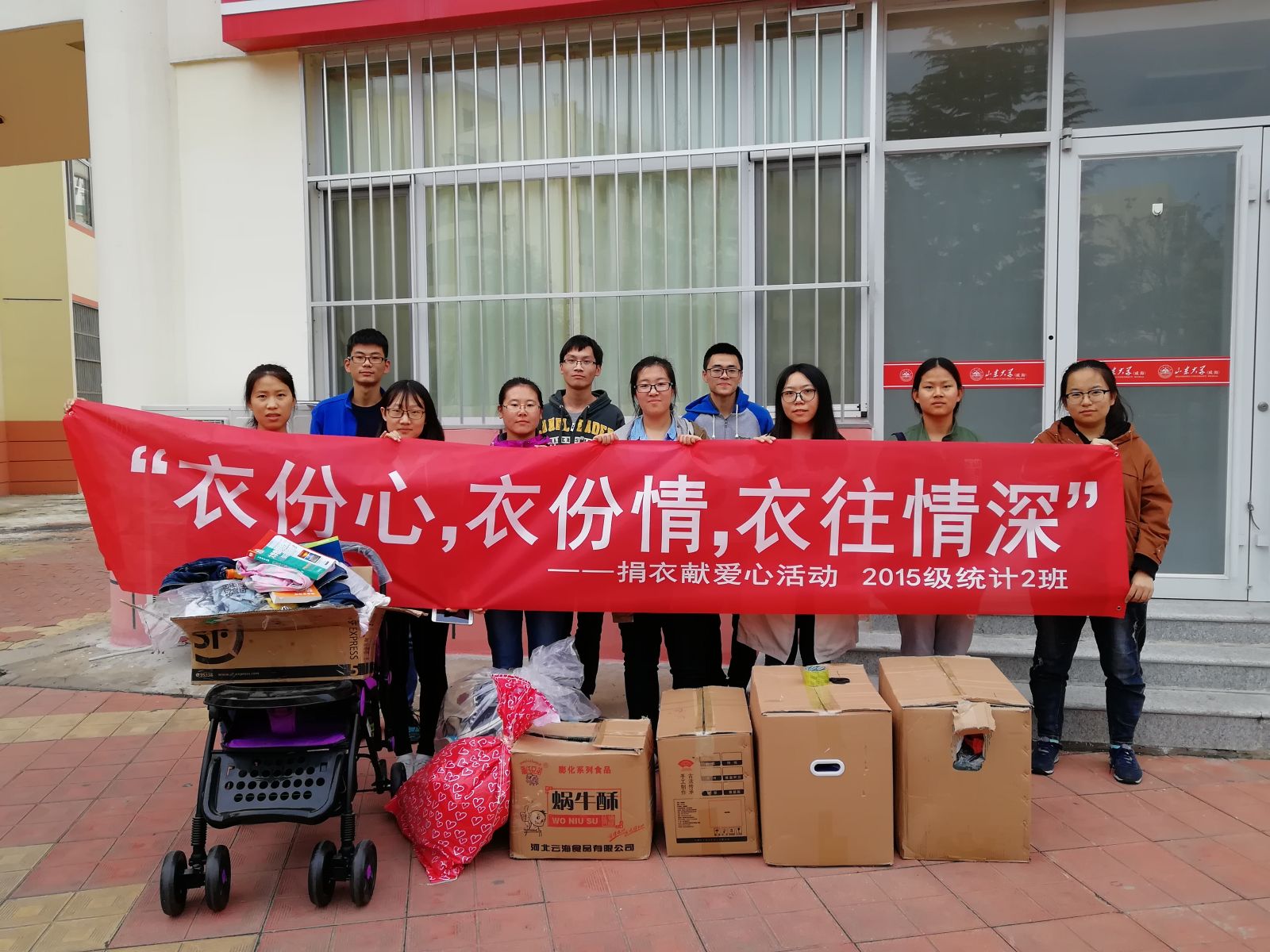 活动开始,团支书郝凯静以“仁者爱人”的古训倡导支部成员用友善仁爱之心回馈社会,发起捐衣献爱心活动。班长赵若杉对本次活动的任务进行分配。每个宿舍将自己不用的衣服整理出来,集合汇总,送至五四广场收集点,再将全部衣物送往威海市长城爱心大本营,由专业人员将衣物送给有需要的人。此外,本班鼓励并倡导其他班级共同参与,2015级数学与应用数学专业、信息与计算科学专业和统计一班也热情地参与了此次活动。