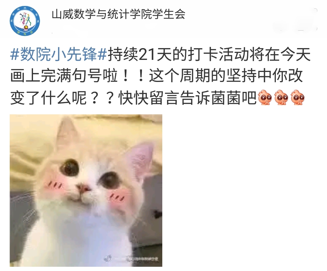 本站讯 4月5号至4月25号期间爱游戏ayx官方网站学生会举办了为期21天的“数院小先锋”微博线上打卡活动,学生会全体成员参与了此次活动。