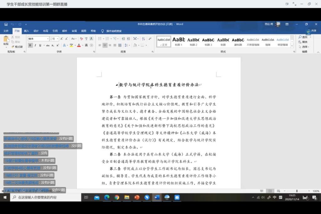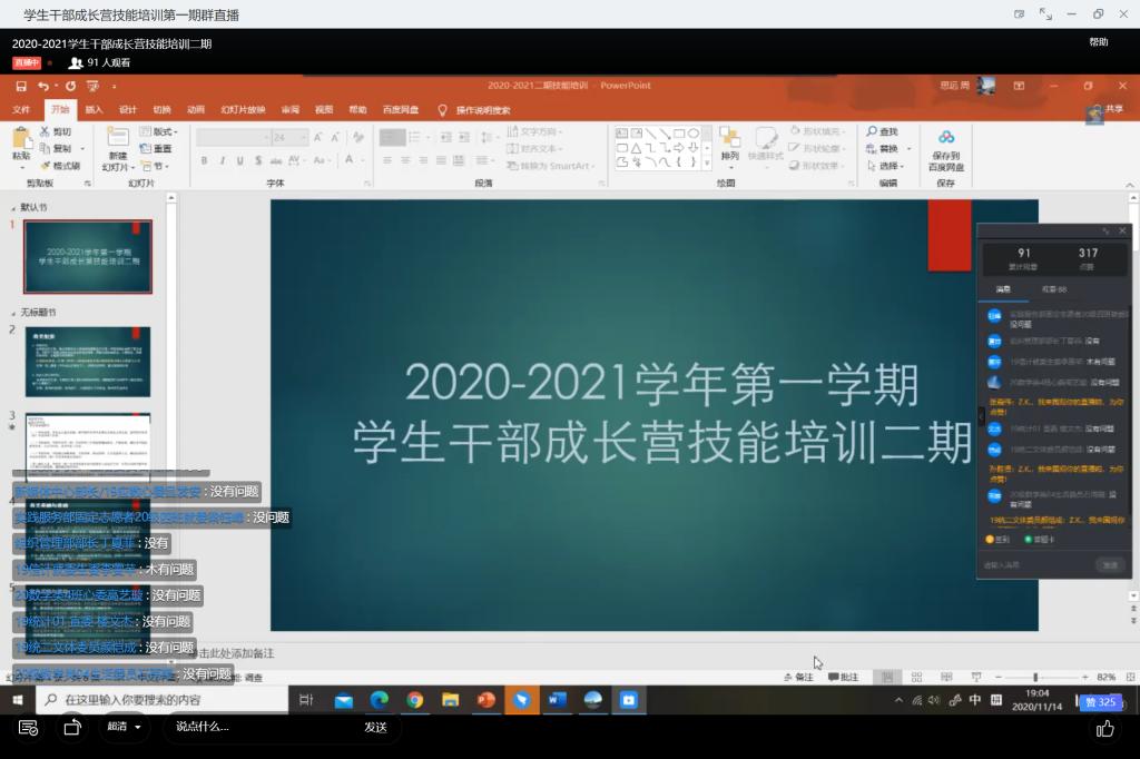 本站讯 2020年11月14日晚上,爱游戏ayx官网通过钉钉直播在线上举行学生干部成长营技能培训第二期活动。院学团中心全体部长、2019和2020级各班班委参加本次活动,本次活动由学院团委副书记周思远主持。