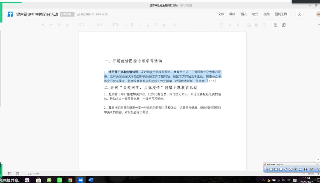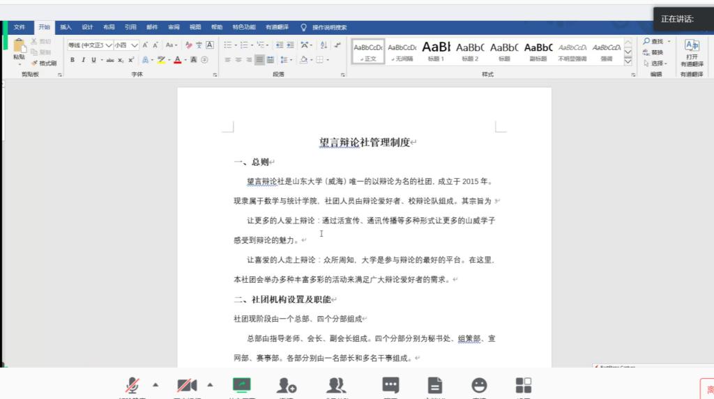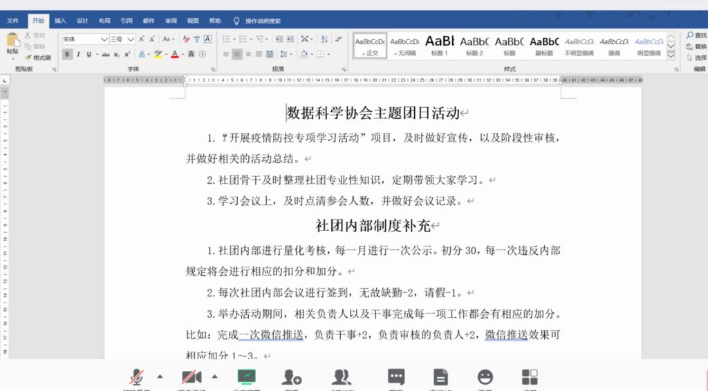 会议伊始,由主持人魏佳佳介绍本次培训会流程。之后,由望言辩论社数据科学协会会长分享各自社团的主题团日活动计划,从活动时间、活动流程、注意事项等方面详细介绍了所要开展的项目。赵德豪发表指导意见,指出各社团可以系统地进行线上主题活动的推送,在团支部内普及疫情相关知识,结合社团职能整理相关经验,并以写信的形式鼓励社员调整心态、认真学习。赵德豪指出,希望各社团骨干在此特殊时期能够积极落实、配合学校学院的工作,带领团支部成员积极度过疫情期。随后,望言辩论社与数据科学协会会长先后介绍各自社团规章制度,内容包括各学生社团总则、宗旨、设置及职能、日常管理制度等,方便老师提出指导意见。最后,社团骨干们对主题团日活动和规章制度所存在的问题进行研讨交流,赵德豪就奖惩及选举制度问题进行说明,魏佳佳对宣传问题及相关注意事项进行补充。