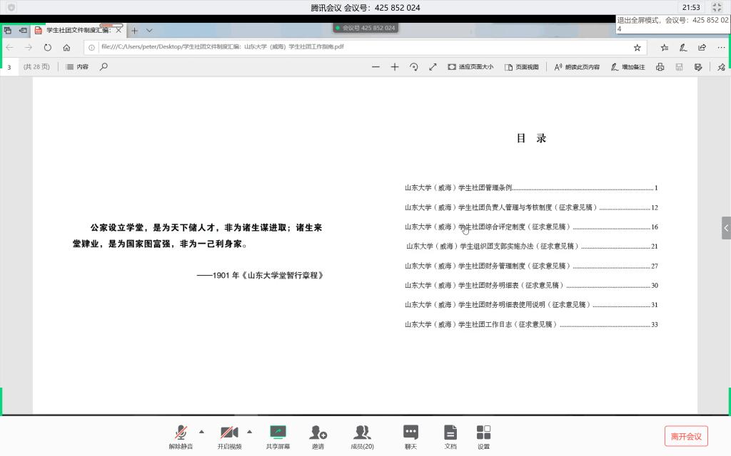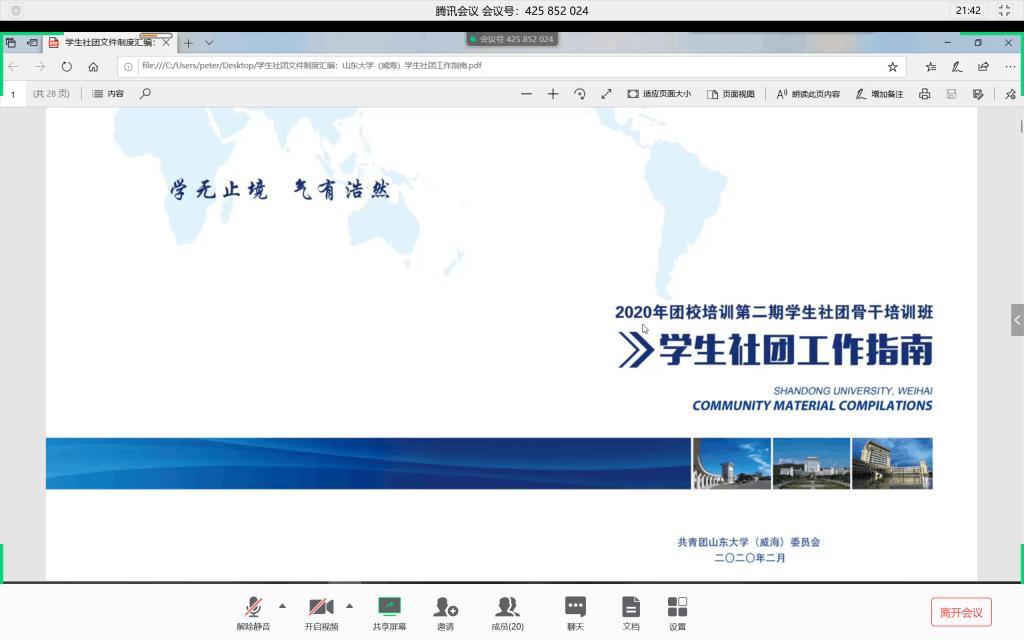 本次会议的开展,既有效组织学习了爱游戏ayx官方网站(威海)学生社团管理条例等重要文件,又强调了学生社团骨干的职责,明确了社团工作目标,指明了社团工作方向,帮助各社团成员在疫情之下坚定信念,有利于社团未来工作的开展。