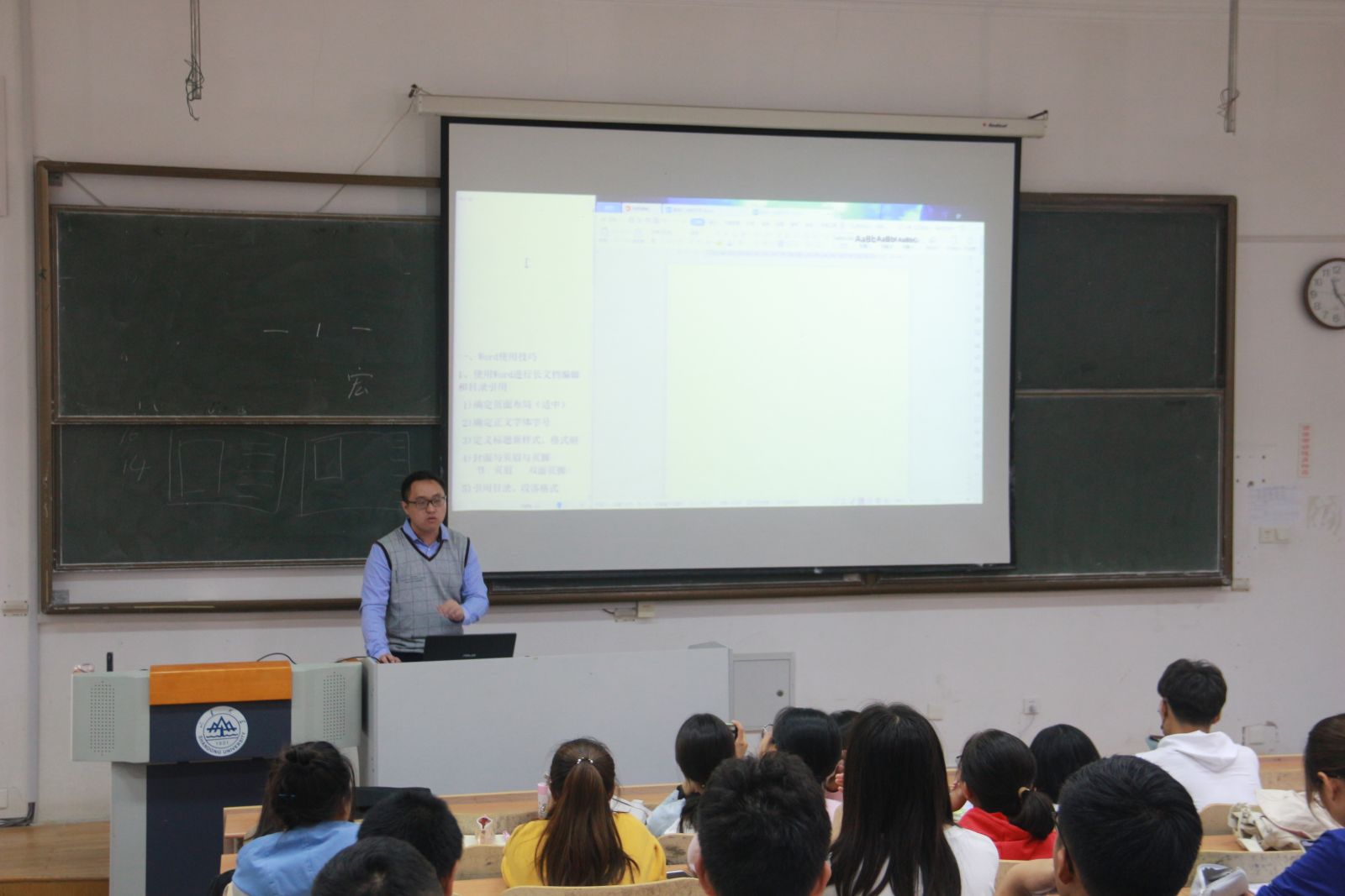 会议伊始,董珂向新生班委介绍本次主讲人及本次培训内容。而后,王浩宇对各班委进行office基本操作的培训,并分别进行演示操作。在Word的使用与操作中,他从长文档编辑的方法、目录的引用以及利用word进行填表三个方面出发,强调了页眉页脚的设置,目录的更新方法以及文件的规范命名与压缩上传;对于Excel的使用与操作,王浩宇提到单元格扩列快捷键和填充柄的使用,并对常用函数的使用和表格打印设置进行详细演示;针对PPT基本操作,王浩宇也向各班委进行简要描述。最后,班团建设部部长董珂进行总结发言,对王浩宇的培训表示感谢,并强调技能培训在各班委学生工作中的重要性,对各班委今后的工作提出了新的要求。
