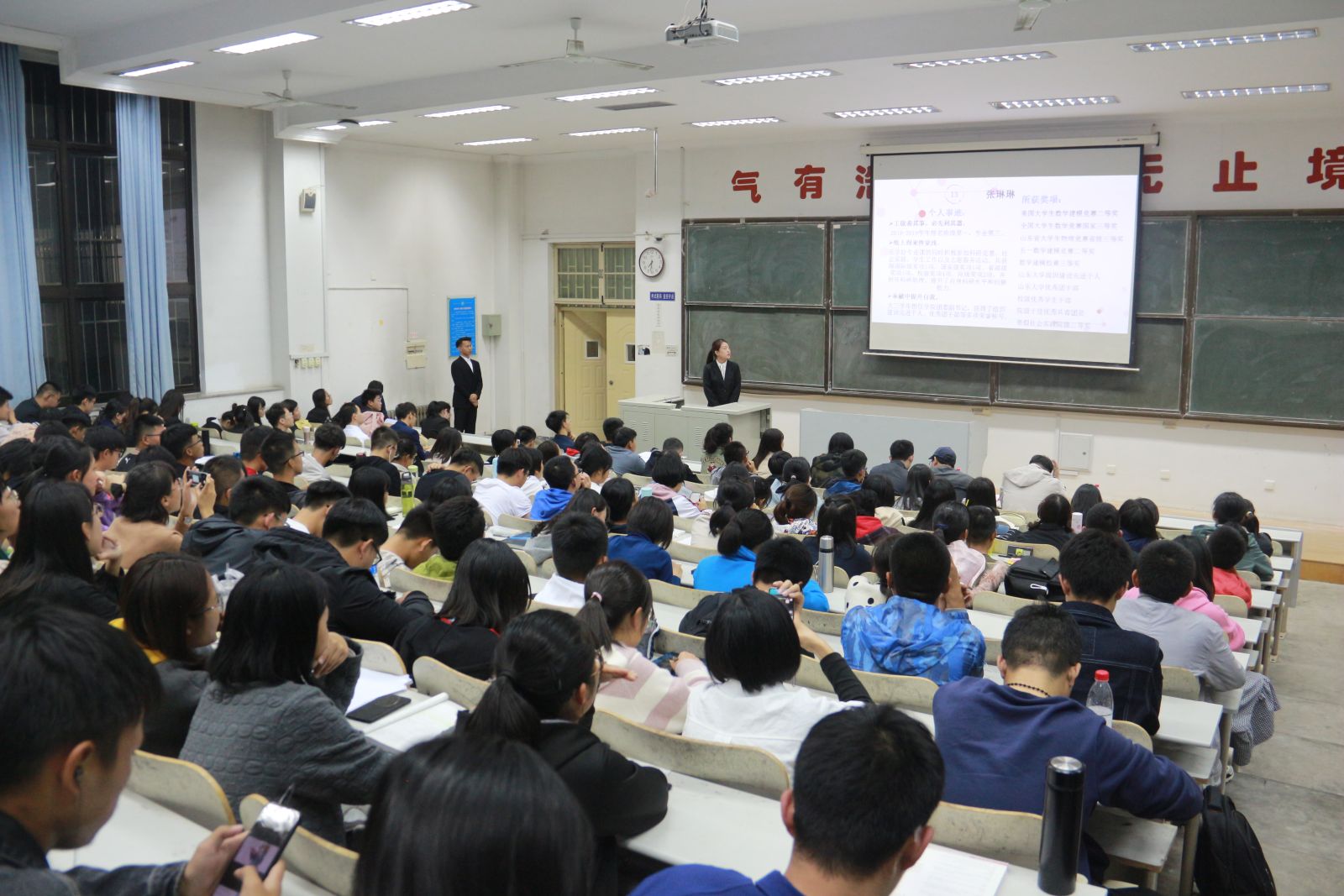 会议伊始,主持人向全体同学介绍评委老师以及答辩流程。会上,二十一位答辩人依次上台,对自己大学以来的优秀成绩、科研成果和丰富经历进行陈述展示,介绍自己在社会实践、数学竞赛等方面取得的优秀成绩,并对自己的未来生活提出了要求和期望。每位选手答辩结束后,在座的同学们都会热烈鼓掌,表达对他们的钦佩与赞叹。最后,王鹏飞对本次答辩会进行了总结,表达了对所有参加答辩同学的肯定,并期望全体19级同学以优秀学长学姐为榜样,刻苦学习,积极进取。会议在热烈的掌声中落下了帷幕。