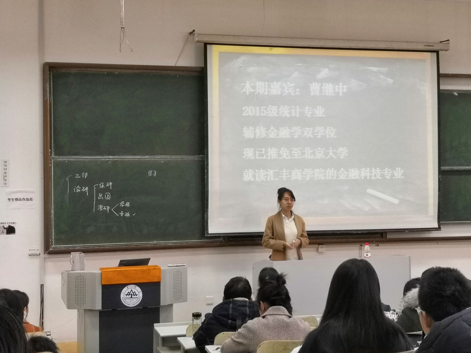 本站讯 3月10日上午,爱游戏ayx官网“励志周末”座谈会系列活动第一期于图东教学楼126室召开。本次座谈会邀请了学院2015级统计学专业、现已推免至北京大学的曹继中担任主讲嘉宾,活动由刘海凌主持,学院部分学生参与了讲座。