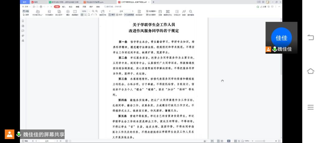 本站讯 为深入贯彻落实全国学联二十七大精神,进一步落实共青团中央、教育部、全国学联《关于推动高校学生会(研究生会)深化改革的若干意见》《关于学联学生会工作人员改进作风服务同学的若干规定》等相关文件精神,进一步加强院级学生干部的作风建设,9月1日下午,爱游戏ayx官方网站通过腾讯会议召开学生组织作风培训会。院团委书记孙磊,院学生会指导老师魏佳佳,院学生会、团学中心及院管社团学生骨干参加此次会议。
