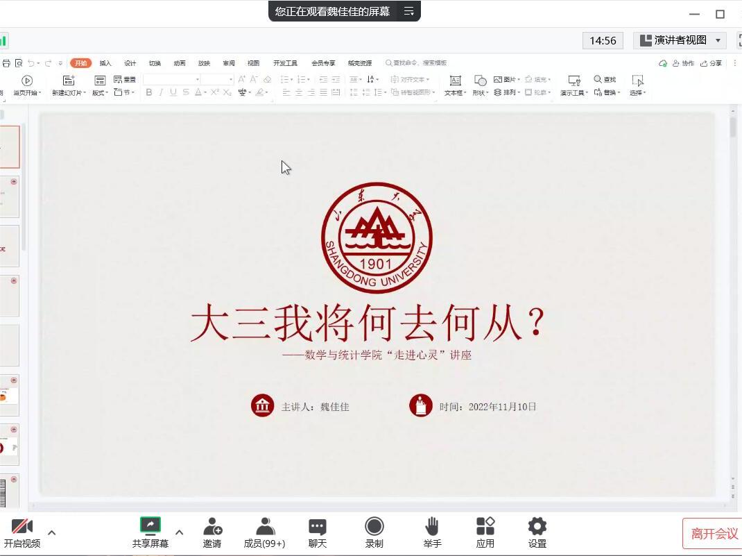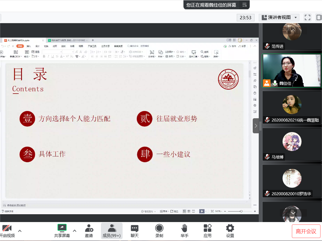 本站讯 为进一步增强学生的自我认知,缓解部分焦虑情绪,11月10日晚,爱游戏ayx官方网站心理工作站举办了“走进心灵——大三我将何去何从?”心理专题讲座。本次讲座由学院辅导员魏佳佳主讲,2020级全体学生同学线上参加讲座。