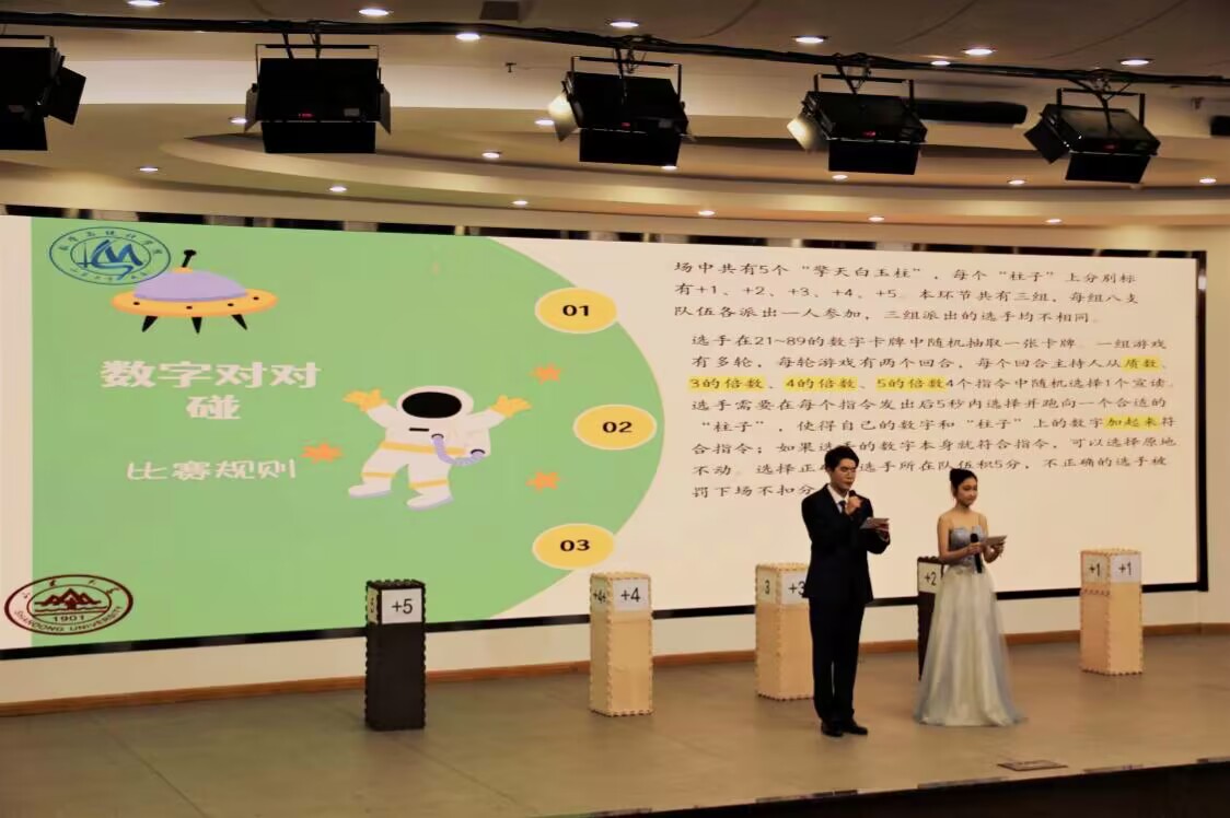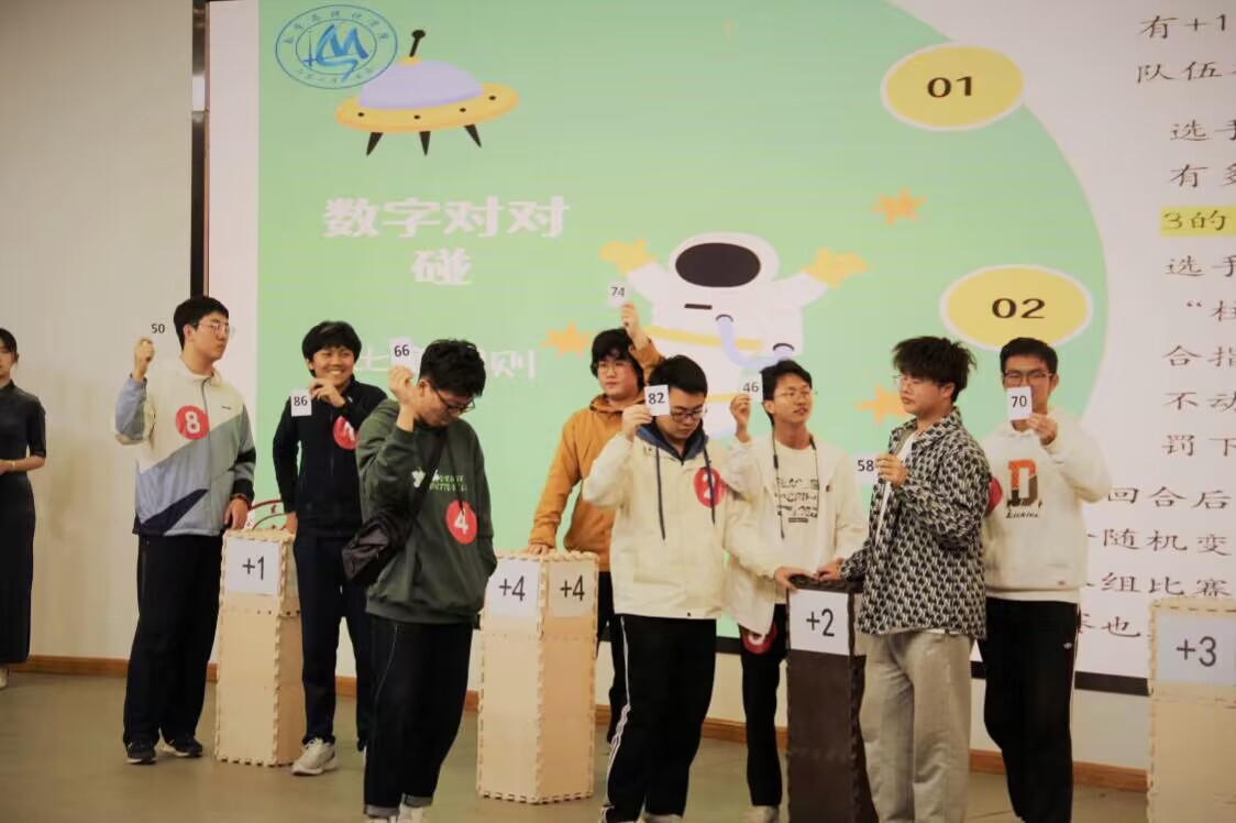 经过激烈的角逐,共有8个队伍合计24名学生进入决赛。比赛共分为四个环节,包括三个正式环节和一个附加环节。第一环节为“初露锋芒”之“知识竞答”,各队参赛选手在规定时间内计算数学题目,需要充分展现清晰的逻辑思路;第二环节为“激流勇进”之“数字对对碰”,选手们对主持人的指令迅速反应,选出与指令相匹配的数字,展现出快速的反应能力;第三环节为“针锋相对”之“四子连珠”,八支队伍采取抽签形式两两一组,并在组内相互对抗,进行棋盘博弈赛,展现出细致的观察力和洞察力;第四环节为附加环节“数字飞花令”,将数学知识与诗词歌赋巧妙结合,使选手与观众们在感受数学魅力的同时,体会传统文化之美。经过几轮的比拼,本次大赛最终评选出一等奖一名、二等奖两名、三等奖两名。比赛结束后,现场老师及嘉宾为获奖选手颁发了荣誉证书。