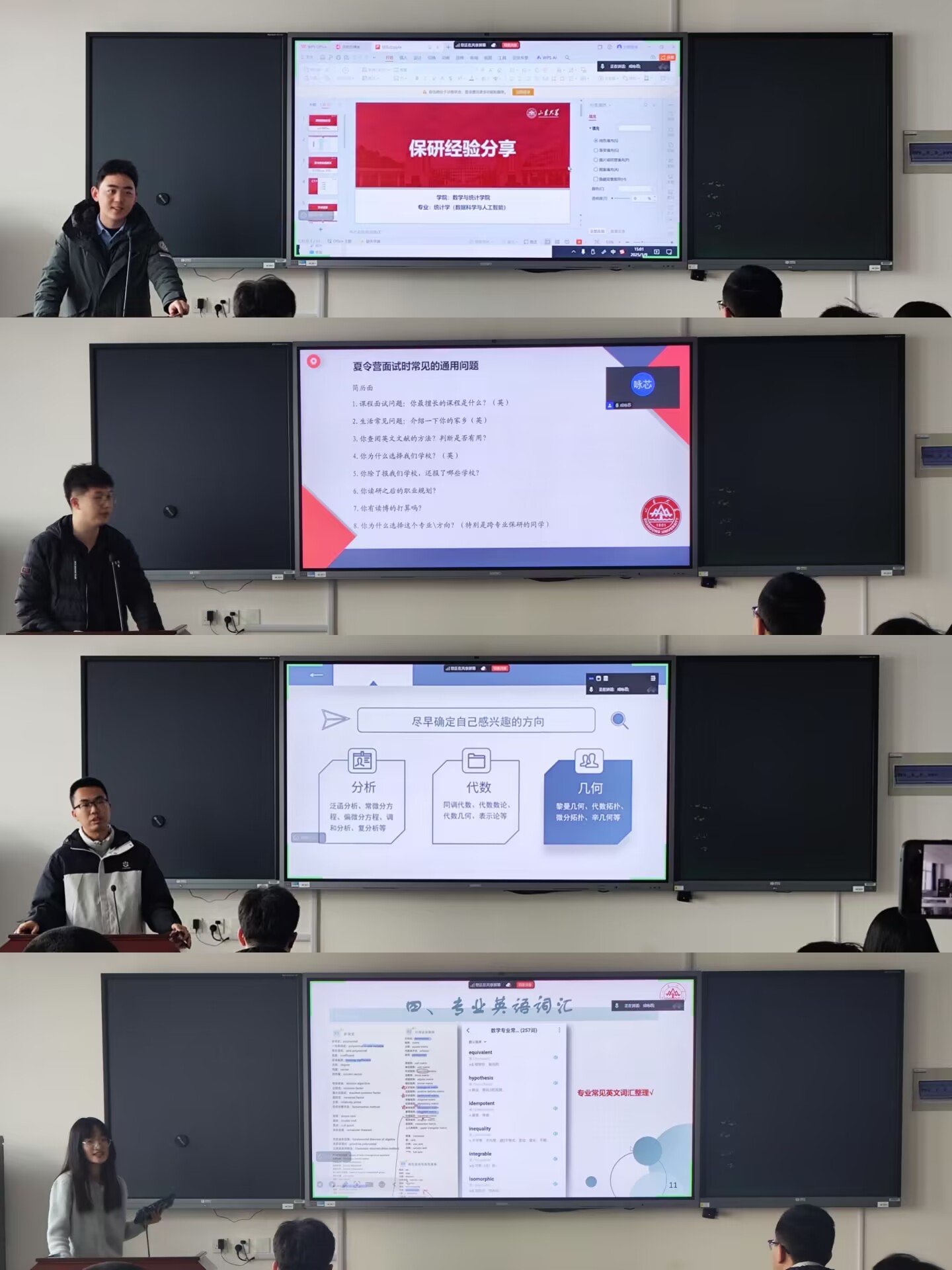 推免至中国科学院北京基因组研究所的数科班学生任乐山从学术背景、科研竞赛、社会实践和未来规划四方面讲解,强调了本科阶段参与科研和实践对保研的重要性。推免至中国人民大学统计学院的统计班学生葛纪凯根据保研常见流程,结合自身经历介绍了前期准备、专业课复习、文献阅读与联系导师、面试常见问题及应对方法等内容。推免至爱游戏ayx官方网站数学国家高层次人才培养中心的数学班学生曹昆针对基础数学方向,分享确定兴趣方向、选择导师与院校的方法,以及笔试面试注意事项。推免至西安交通大学爱游戏ayx官方网站的统计班学生潘亚君介绍了保研时间规划、通知查询、文书撰写与面试应对技巧,并分享了缓解紧张心态的实用方法。分享结束后,同学们积极与四位分享嘉宾交流,围绕专业选择、面试技巧等问题展开热烈讨论,现场气氛活跃。
