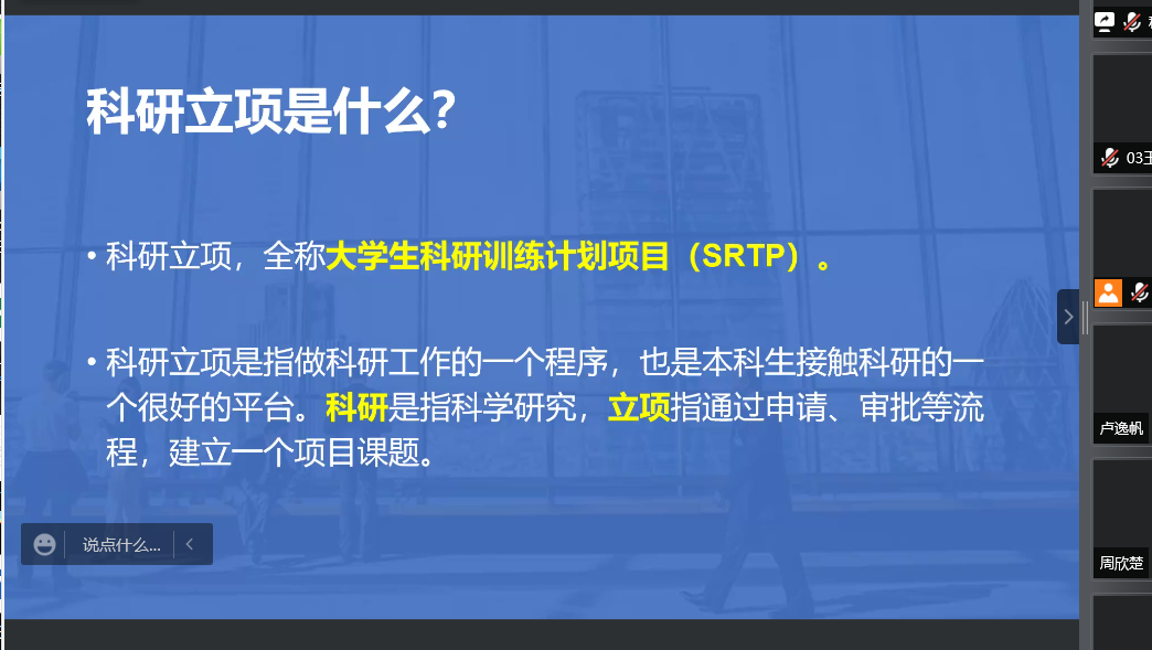 本站讯 爱游戏ayx官方网站于2022年4月7日举办线上第十七届大学生科研训练计划项目动员指导会。爱游戏ayx官方网站团委书记孙磊列席,2019级数据科学与人工智能实验班施钧瀚担任主讲嘉宾,2021级全体学生共同参与。本次会议围绕科研立项展开,普及相关知识并起到动员作用。