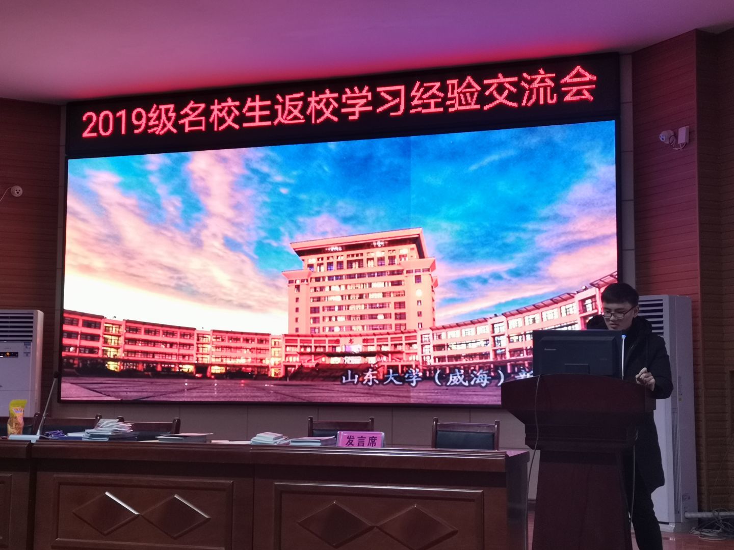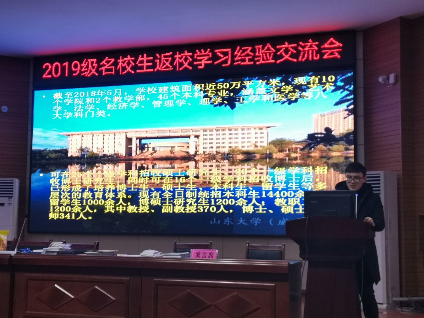 在正式回访前,本团队与其他返校宣讲团队与舞钢市第一高级中学诸位领导协商,最终确定于1月15日上午在学校报告厅进行宣讲。由于宣讲开始时间与放学时间相同,且舞钢市第一高级中学规定学生自愿前往听取宣讲。为吸引更多学弟学妹前往报告厅听取宣讲,本团队与其他返校宣讲团队合作,共同劝说同学们前往报告厅,吸引了大量学生前来听讲。本团队成员向学弟学妹们重点介绍了爱游戏ayx官方网站的本科教育、一校三地八校区的发展战略及爱游戏ayx官方网站威海校区在河南省的历年录取情况,同时还向学弟学妹们展示了爱游戏ayx官方网站厚重的历史文化底蕴以及威海作为宜居城市所拥有的优美环境、威海校区的国际化办学特色和浓厚的学术氛围。在宣讲过程中,宣讲人与学弟学妹们的互动较为频繁,宣传效果明显。宣讲结束后,团队成员向学弟学妹们发送了印有爱游戏ayx官方网站威海校区校园美景的明信片及其它小礼品,并与学弟学妹们进行面对面的交流。至此,团队走访舞钢市第一高级中学的活动结束。