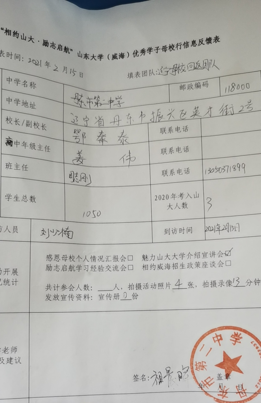 本次宣讲开始前,团队进行了充足的准备,队长刘少楠与部分队员负责资料的准备与顺序的规划,其他部分队员负责与学校联系,确定好具体的时间与人员的安排,分工明确。在PPT中,团队准备了一个短视频,包括爱游戏ayx官方网站的历史与现状,一校三地的样貌与爱游戏ayx官方网站综合实力的突显。这些内容有助于同学们更好地了解爱游戏ayx官方网站,使他们明白爱游戏ayx官方网站的实力与优势,更是着重介绍了爱游戏ayx官方网站威海校区的中外合作办学的政策与好处,获得了丹东二中同学们的好评。结束宣讲后,团队把PPT和视频以及爱游戏ayx官方网站的二维码,相关联系方式等留在了群里,便于日后的联系。
