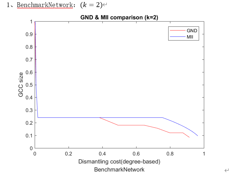 本次科研过程中,团队成员分工明确,配合较好。调研前期,团队成员李景祎通过中国知网等各种网络渠道,搜集了大量有关此课题的文献研究资料,包括这一问题的背景、已解决及未解决的问题及相关领域应用前景等。与此同时,团队其他成员进行了对图论、运筹学、数学模型等与本课题有关的专业基础课程的学习。通过对搜集的信息进行分析、加工与整理,以及将所学习的专业知识及自己对于该问题的理解相结合,完成了以“最小攻击代价”为目标函数的GND网络拆解模型的建立。为了检验模型的实际攻击效果,刘洋洋针对七个测试集合进行了网络拆解,并给出了归一化的标准节点代价与图中最大剩余连通分量节点数与节点总数的比值关系的图像,充分展示了模型的动态网络拆解效果,并由此给出模型客观评价。随后,团队成员充分分析了所建立的GND通用网络拆解模型的优点与缺点,在借鉴其充分考虑特定节点“攻击代价”的基础上,给出了一种全新的MII网络拆解模型,在给定的循环约束下,该模型可对节点网络进行动态拆解。为测试其模型效果,再次针对测试集合进行测试,并作出改进与评价,直至得出现行动态网络拆解效果最优化的模型方案。至此,团队的所有科研实践内容基本结束。