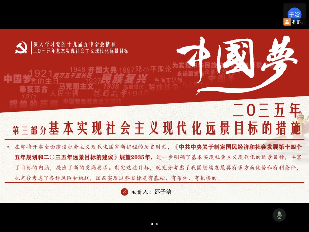 本站讯 1月30日,“看五中全会,学中国精神”宣讲团队队员邵子浛于辽宁省沈阳市开展线上宣讲活动。本次宣讲面向对象为沈阳市天光社区居民,参会人数共45人。宣讲过程中,邵子浛通过回顾过去、展望未来的方式让居民对党的十九届五中全会有更加深刻的了解。