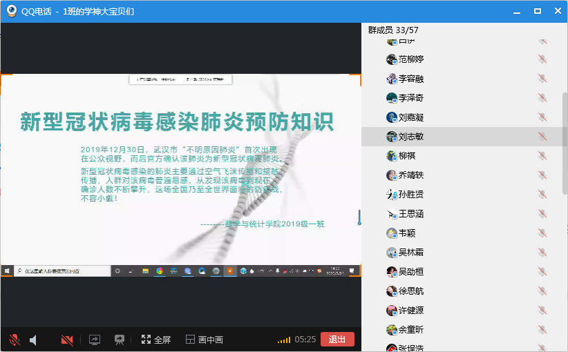 班会伊始,团支书陈姿言组织大家进入语音线上直播,并阐明了此次线上班会的主题。首先,组织委员秦美凤开始就PPT和大家一起进行疫情知识的学习,学习内容分为两个方面:对于新型冠状病毒肺炎的认识以及针对网上谣言进行了破谣,希望大家疫情期间能够科学防控,不信谣、不传谣。团支书陈姿言结合主题向大家提议“找些事情做”,介绍了一些疫情期间可行的学习方法和学习内容,并提出应该做好“学习+”活动,对之前同学们的进行的“学习+运动”活动持着赞同态度。最后,王祎璠进行了此次线上班会的总结,并对大家关心的开学时间、返校问题、成绩问题进行了一一解答,并提倡同学们在疫情期间做好科学防护的同时合理规划时间。