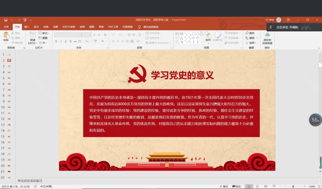 在本次主题团日活动中,通过团支书乔靖轶的讲解,同学们对党史进一步熟悉,深刻认识到中国共产党的伟大和重要性,为同学们进一步坚定中国共产党的领导打下良好基础。