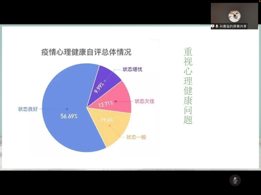 针对近期疫情形势,张嘉伟分别就防范德尔塔毒株和进一步加强疫情防控工作的要求进行了详细的说明。张嘉伟提出,新冠变异病毒德尔塔毒株传染性增强,传播已广泛,但疫苗仍有效;避免“突破感染”,尽量避免前往中高风险区,积极接种新冠疫苗;提出进一步加强疫情防控工作的几点要求:全体学生随时关注健康码和通信大数据行程卡、暑期离校学生暂不返校、在校生暂不离校。张嘉伟着重强调了建立“辅导员-班委-舍长-同学”四级网格化机制,实行网格化管理。随后孙善玺和陈荟如针对疫情下的心理健康防护,提出“别让自己的情绪染上‘病毒’”。孙善玺和陈荟如提出,正确认识疫情,不轻信传言,不过度解读,积极关注防控信息;重视心理健康问题,正确认识疫情隔离中存在的典型心理健康问题;积极疏导,缓解焦虑,及时寻求专业帮助。