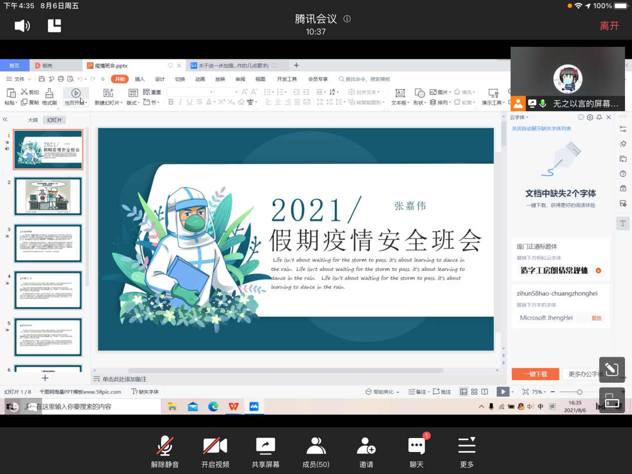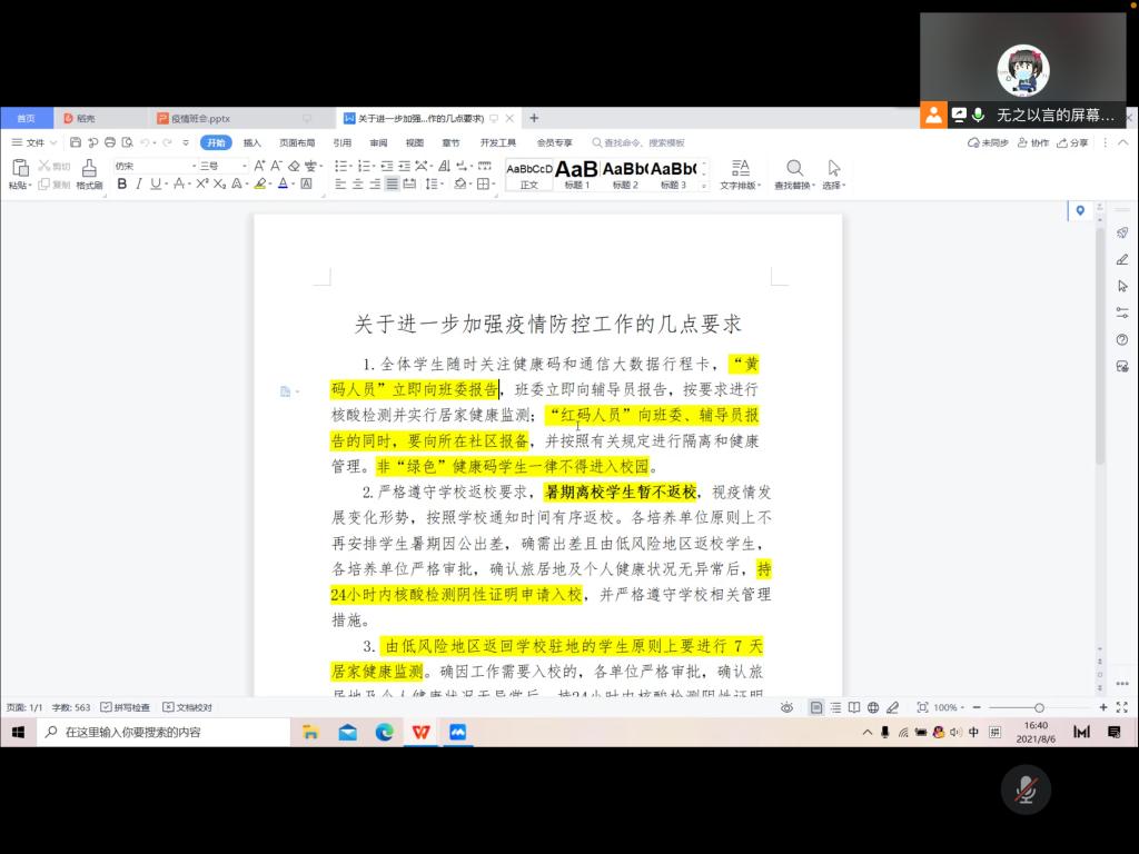 本站讯 为响应国家疫情防控政策,进一步加强疫情防控工作,提高暑假防疫意识。8月6日下午,爱游戏ayx官方网站2020级统计1班开展了疫情防控和心理健康安全会议。本次会议由生活委员张嘉伟和心理委员孙善玺、陈荟如主持,2020级统计1班全体学生参与。