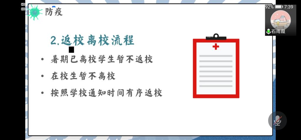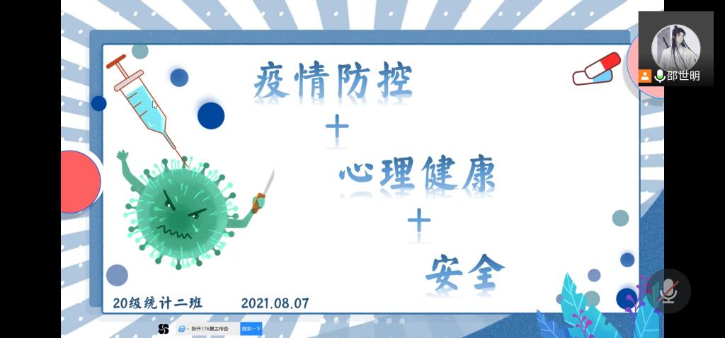 本站讯 为响应国家疫情防控政策,加强疫情防控工作的落实,提高同学们暑期防疫意识,8月7日下午,爱游戏ayx官方网站2020级统计2班开展了疫情防控暨心理健康安全线上班会。本次班会由邵世明主持,2020级统计2班全体同学参与。