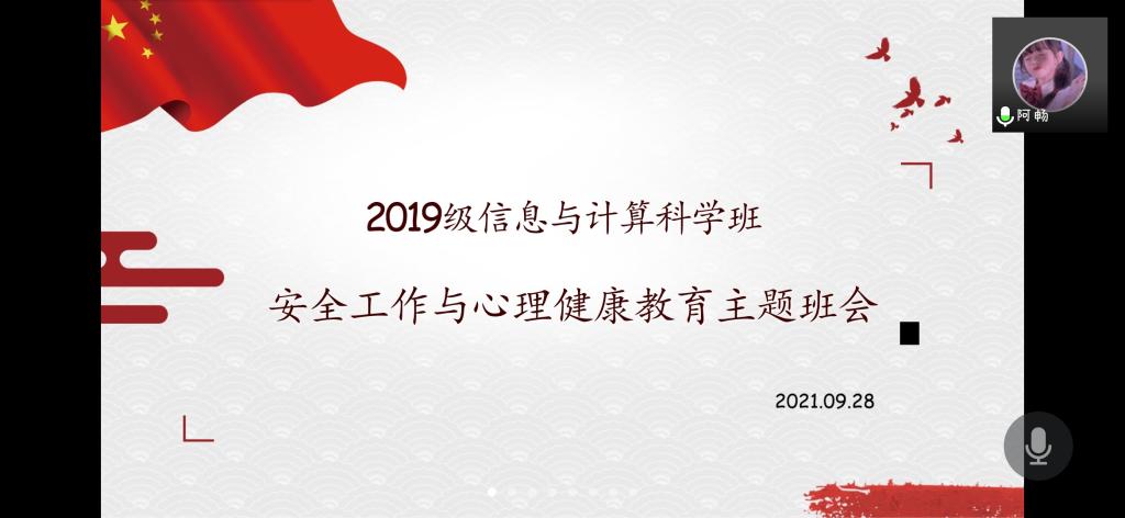 本站讯 2021年9月28日下午四点半,爱游戏ayx官方网站2019级信息与计算科学班于腾讯会议举办“安全工作与心理健康教育”主题班会。本次班会由2019级辅导员王祎璠主持,共58人参加。