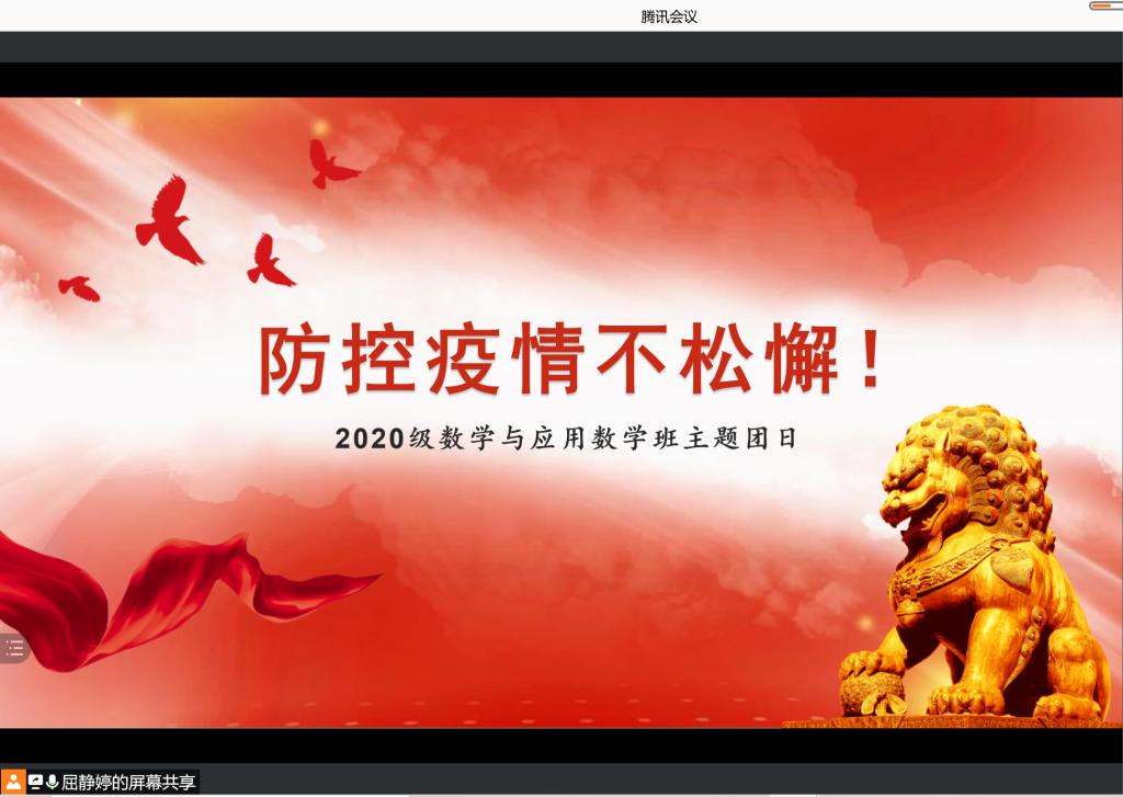 本站讯 为响应国家疫情防控政策,顺应当下疫情局势。10月4日上午,爱游戏ayx官方网站2020级数学班开展了“防控疫情不松懈”主题团日活动。本次活动由2020级数学班团支书屈静婷主持,2020级数学班全体团员参与。