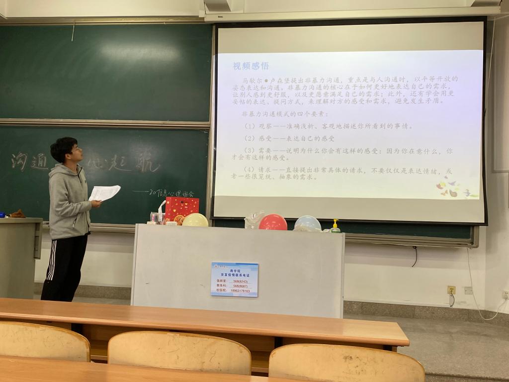 活动伊始,赵文硕强调班会注意事项,鼓励同学们积极参与活动,并做好聆听者。热身活动“保护气球”环节中,倪嘉杭为全班同学分发气球,同学们需按要求抛出气球,并保证气球在两分钟内不落下,即为游戏成功。游戏共进行两轮,其中第一轮同学之间不能通过语言沟通交流。该游戏旨在让同学们认识到人际沟通中语言沟通的重要性。过渡游戏“你说我猜”环节中,选出五组“传达者”与“倾听者”,“传达者”描述,“倾听者”猜词,其中前两组“倾听者”不能提问。本游戏让同学们认识到了人际沟通的双向性。接着,赵文硕播放非暴力沟通视频,介绍了非暴力沟通的概念,带领同学们学习理解非暴力沟通四要素:观察、感受、需要、请求。而后,同学们在纸上写下自己在人际交流方面问题,结合非暴力沟通四要素,同小组成员分析其形成原因,讨论提出解决意见。最后,同学们踊跃发言,表达了此次班会中自己的感受与体悟。