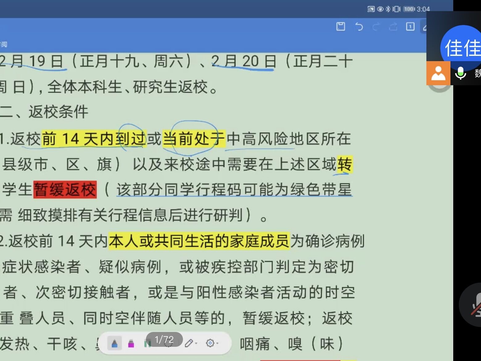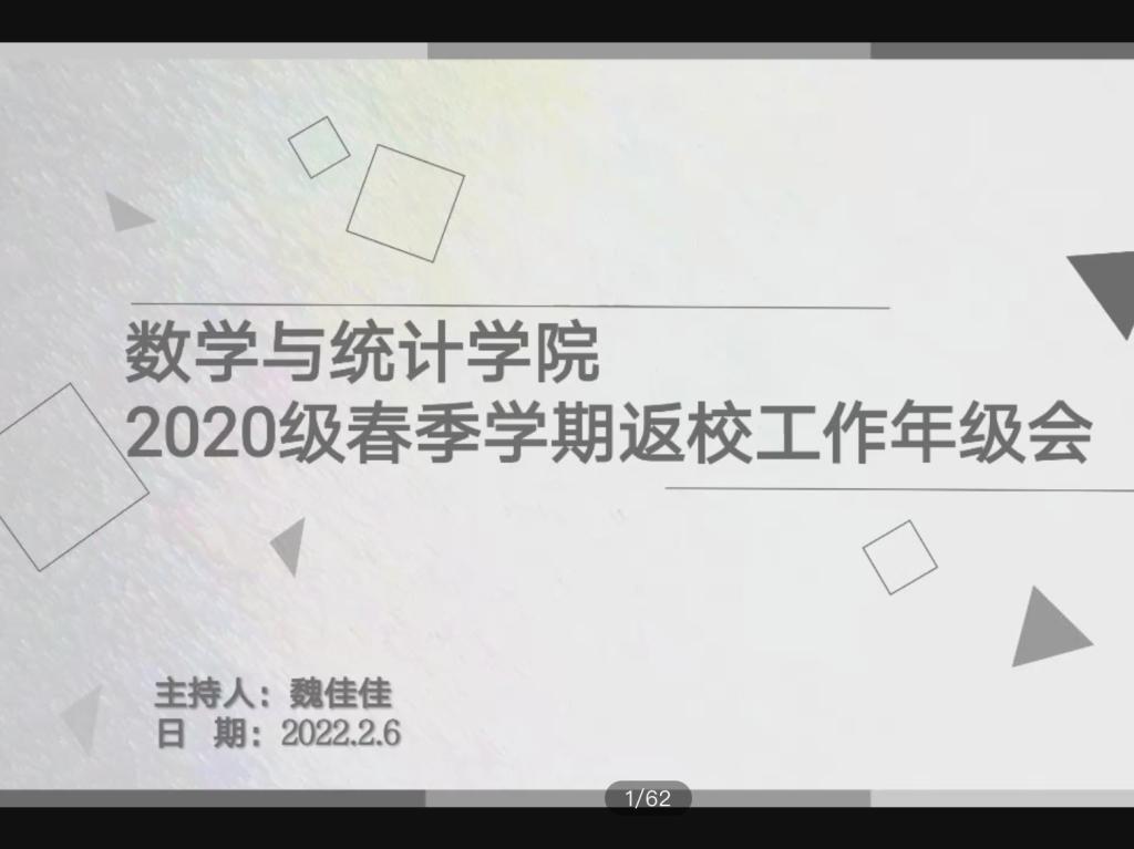 本次会议主要围绕春季学期返校工作展开。首先由魏佳佳向同学们送出新年祝福,并询问了同学们的假期状态。接着她介绍了2022年春季学期返校工作的具体要求,对返校时间、返校条件、返校流程等作出详细说明。魏佳佳提醒同学们要严格按照疫情防控工作要求进行返校前14天的健康监测;近期减少流动,不离开居住地;返校途中注意疫情防控等。返校工作安排结束后重申疫情防控和安全问题,着重强调同学们需按时提交返校申请,关注健康码、行程码状态,返校前提供48小时内的核酸检测阴性证明,有特殊情况及时上报辅导员,并提醒同学们正式开学两周内会实行校园相对封闭管理。最后魏佳佳对同学们就近期开学提出的问题进行了回答,并作出最后的总结。