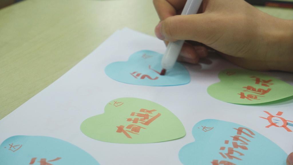 接下来进行“神秘商店”环节,目的是让大家发现自己的优点和缺点,加深对自己的认识,发现缺点中的美,从而接纳自己,增强自信心和自尊心。吕发安、王艺璇给每个人下发A4纸与便利贴后,同学们先在白纸上写上自己商店的名字,并“添置”自己的“商品”,在便利贴上写上自己的优缺点,并在每张便利贴的右上角写上自己的名字后,在组内进行商品的自由买卖,至少交换自己的一个缺点。分享完之后,在白纸后面写上自己想说的话。