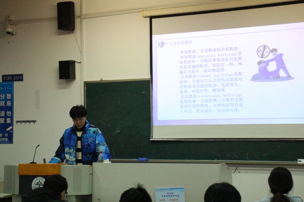 本次班会分别从“什么是校园霸凌”、“为什么会有施暴者”和“如何避免和预防”三个部分展开讲解。首先,班长赵大成从身体欺凌、言语欺凌和关系欺凌,主动性欺凌和反应性欺凌以及新兴的欺凌类型——网络欺凌几个方面向大家介绍了什么是校园霸凌,让大家对校园欺凌的类别有了更加清晰的了解。之后,赵大成从家庭环境、受害者心理等方面分析了产生施暴者的原因,并针对网络施暴者的形成原因进行了单独分析,引导同学们回想在日常生活中有没有遇到这样的霸凌者和霸凌行为。借此,赵大成从自己和他人受到欺凌两种情况下应该如何拒绝校园霸凌向大家进行了详细的介绍,向大家分享了应对校园暴力的口诀,并向大家宣传不做施暴者与同学友好相处的正确观念,同时要提高自身的防护意识,勇敢拒绝各类霸凌。