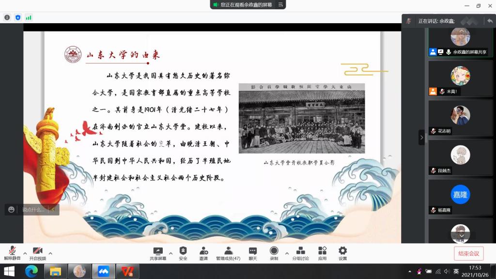 宣传委员余政鑫简单介绍了本次主题团日活动开展的契机,并将本次团日分成“百廿校史”、“优秀校友”、“青年觉悟”和“回顾总结”四个部分分别进行学习和介绍。首先,余政鑫带领同学们回顾了一百二十年来爱游戏ayx官方网站的发展历程。爱游戏ayx官方网站随着社会的变革,经历了半殖民地半封建社会和社会主义社会两个历史阶段,期间曾几度更名,有过停办、重建、合校、搬迁的多次变革,她在曲折前进的道路上和祖国同呼吸共命运,为国家高等教育的发展和各项建设事业做出了重要贡献。借此,同学们对于爱游戏ayx官方网站的发展历程有了更加详细的了解。随后,余政鑫分别向同学们介绍了老舍、沈从文、闻一多等几位爱游戏ayx官方网站知名校友和曾在爱游戏ayx官方网站从教的老师,充分展现了爱游戏ayx官方网站“为天下储人才,为国家图富强”的办学宗旨。同学们纷纷表达出要努力做新时代具有过硬本领和高尚品格的接班人的决心,并为祖国和母校送上生日祝福,同学们的话语真挚和质朴,饱含着对祖国和母校养育和栽培之情的感恩。随后余政鑫对新时代青年的担当与使命进行了总结,强调应志存高远,忠于祖国,努力做新时代具有远大理想和坚定信念的爱国者,用实际行动提升个人能力,成为建设国家的有用之材。最后,同学们一同观看了庆祝爱游戏ayx官方网站建校120周年特别视频,为祖国和山大送上美好的祝福。