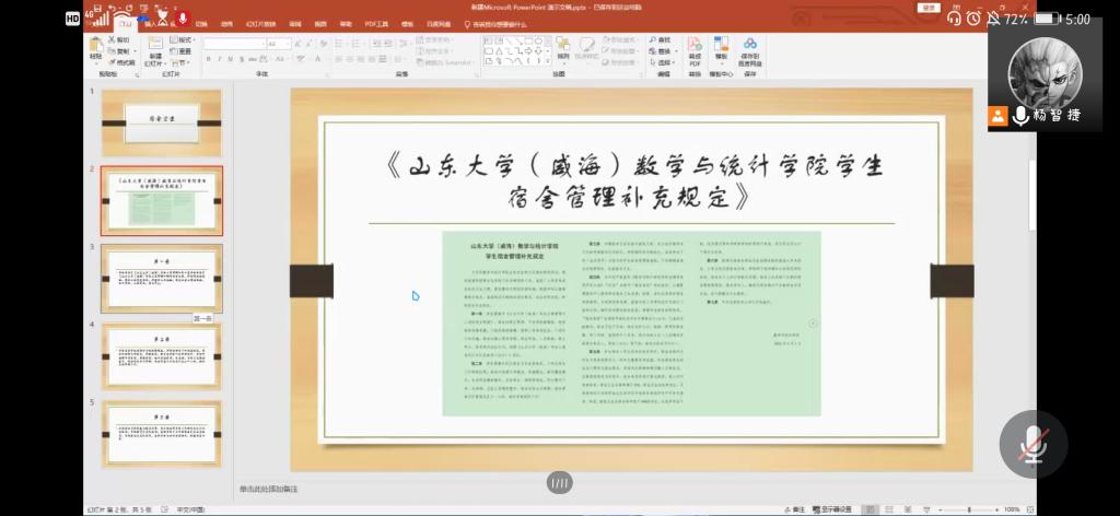 杨智捷首先强调了召开此次班会的背景——由于最近宿舍违规使用电器事件频繁发生,为保护同学们的生命财产安全,营造整洁文明的宿舍环境,特召开此次主题班会。在简单说明原因后,杨智捷向大家介绍了《爱游戏ayx官方网站(威海)爱游戏ayx官方网站学生宿舍管理补充规定》,并对前三条进行重点说明。此外,他强调在学生推优入党以及各类评奖评优中,宿舍表现作为学生日常表现要求之一将作为重要参考依据,并提醒同学们辅导员将定期与不合格宿舍成员谈话,进行提醒及口头教育。随后,王肖晴进行补充,并针对“我为青年做件事”问题征集活动、青年大学习完成积极性以及“庆祝建党百年 展现青春担当”升国旗主题团日活动三个事情进行了简单说明及动员。