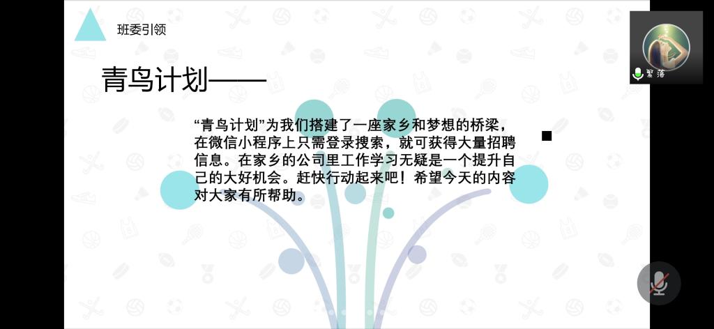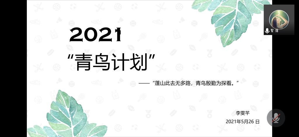 本站讯 2021年5月27日上午十点半,爱游戏ayx官方网站2019级信息与计算科学班于腾讯会议举办“青鸟计划”主题团日活动。本次活动由信息与计算科学班就业委员李雯芊主持,共49人参加。