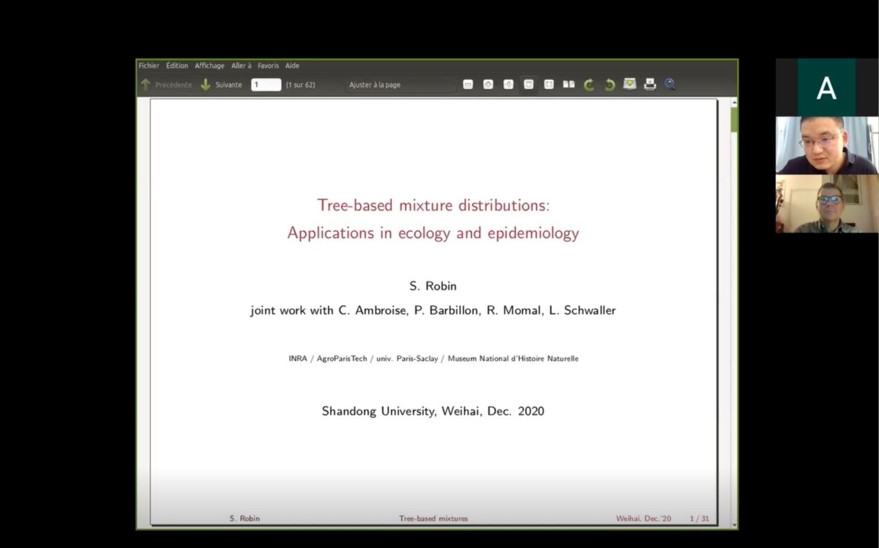 On the afternoon of December 22, 2020, Stéphane Robin, Senior Researcher at Institut National de la Recherche Agronomique (France) gave an online report entitled ”Tree-based mixture distributions: Applications in Ecology and Epidemiology”. Director of statistics department, Wang Xiaoqiang presided over this talk. Faculty members Zhou Li, Yang Fengkai, Qi Xingqin and graduate students attended this online meeting.